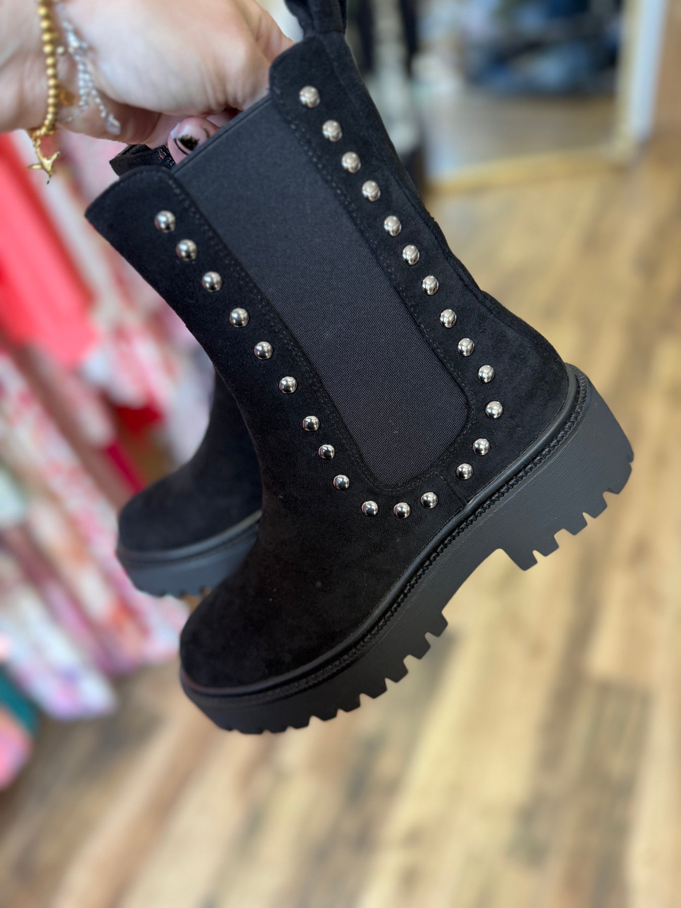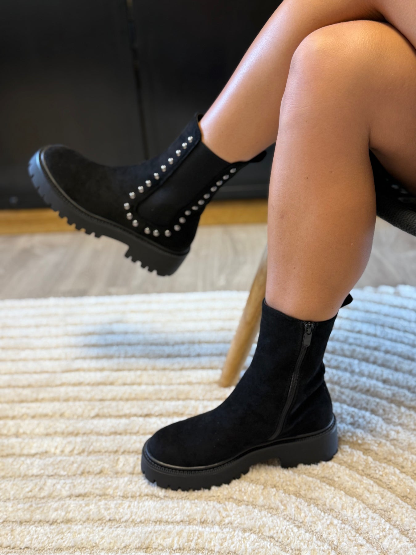Ces bottines noires sont le parfait mélange entre confort et style. Leur semelle crantée assure un bon maintien, tandis que les clous argentés ajoutent une touche rock qui dynamise n’importe quelle tenue. Avec une robe à pois comme sur la photo, un jean slim ou même un short, elles deviennent la pièce forte de votre look automne/hiver. 🔥