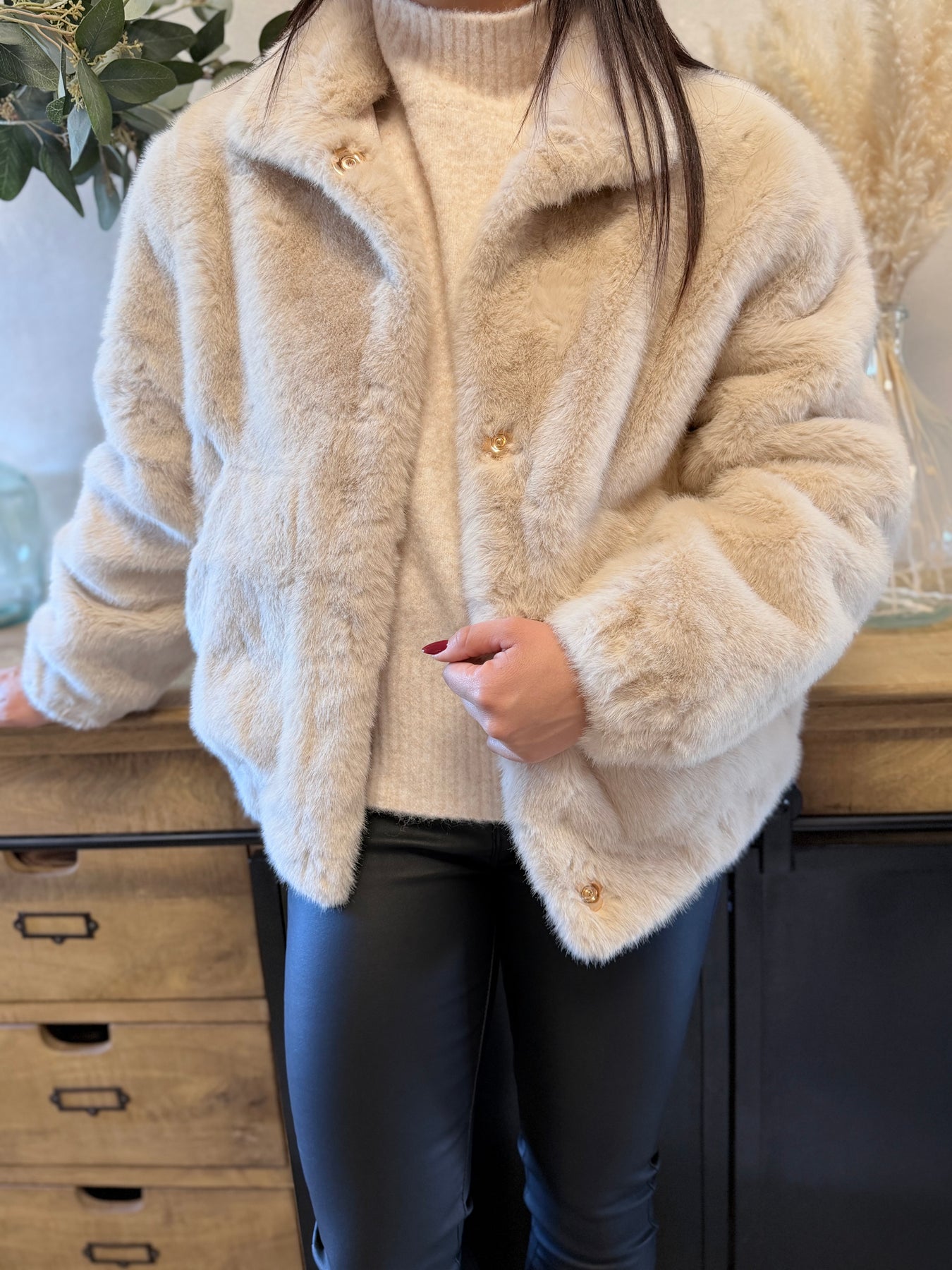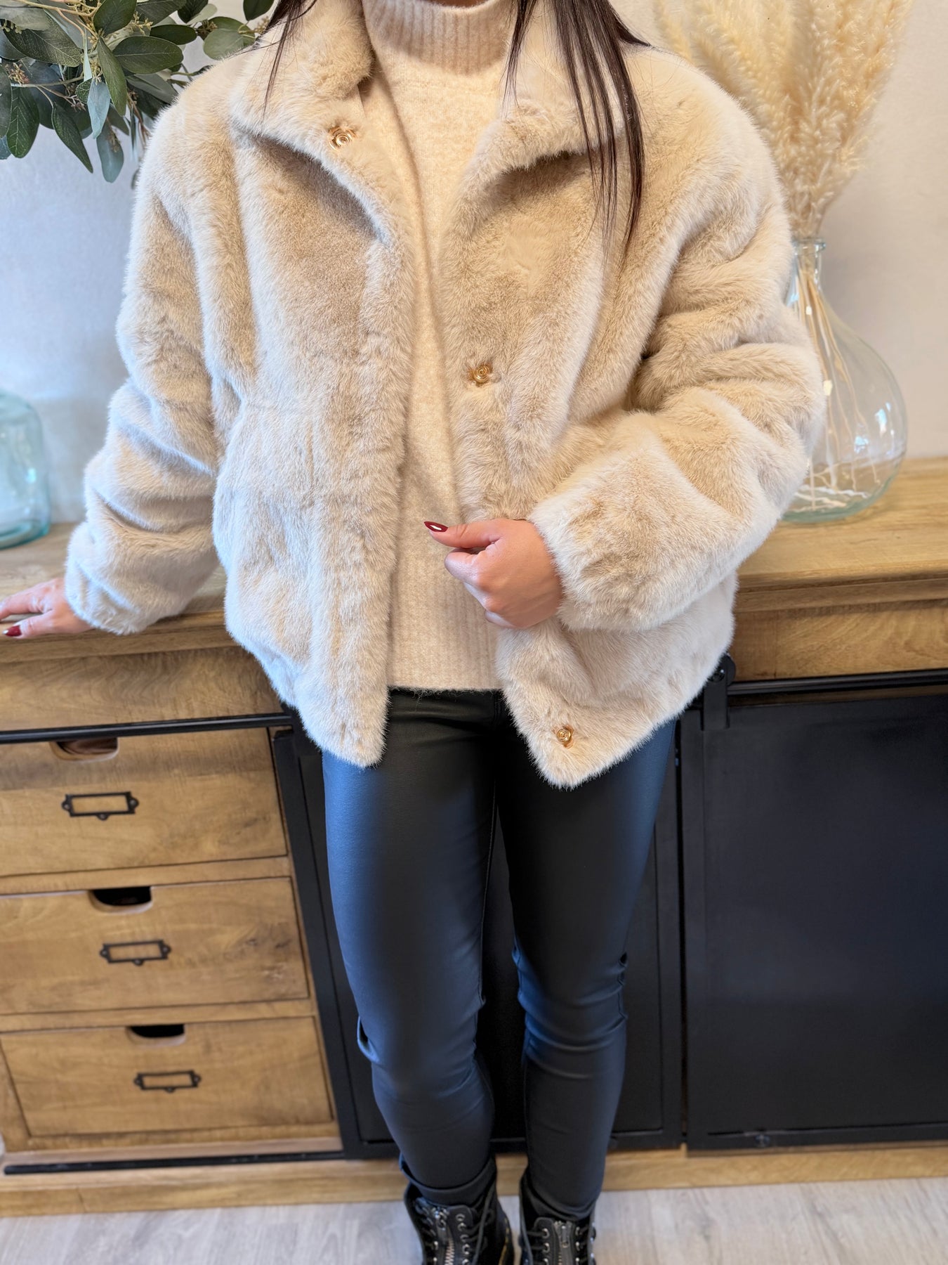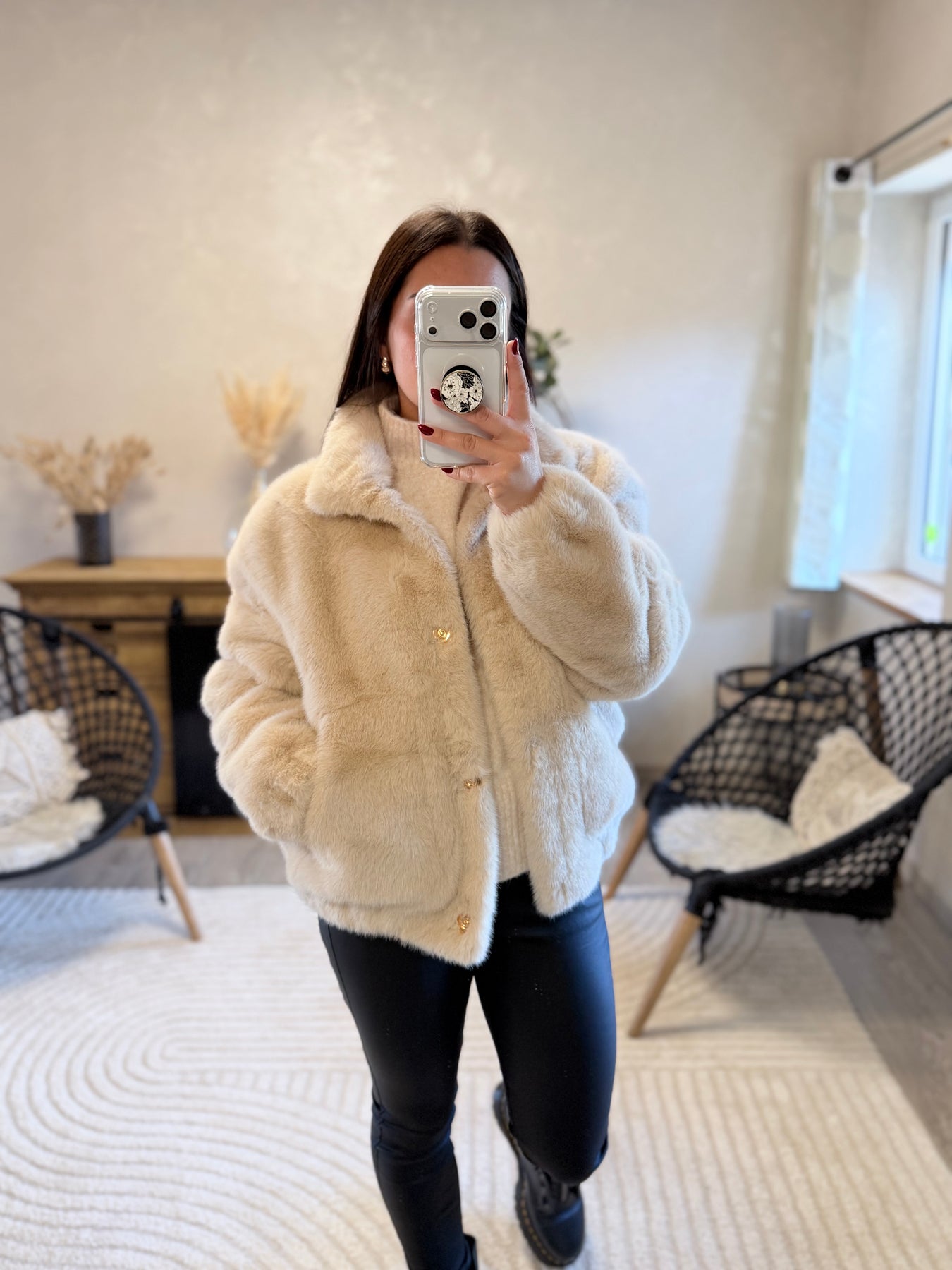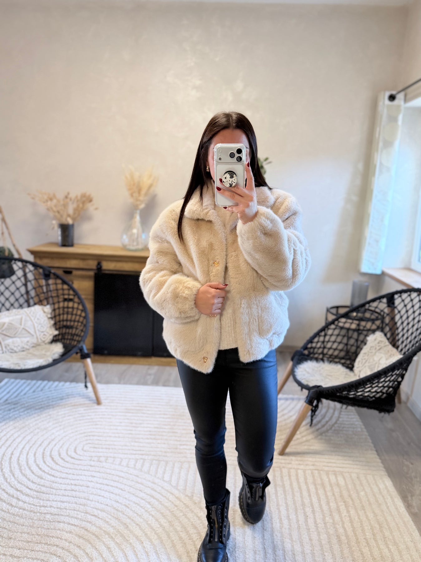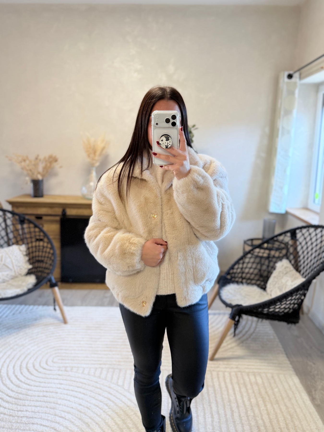 La fourrure “Amandine” est parfaite pour affronter le froid avec style. On aime son toucher tout doux, sa coupe moderne et ses détails dorés qui apportent une touche raffinée à tous tes looks d’hiver.