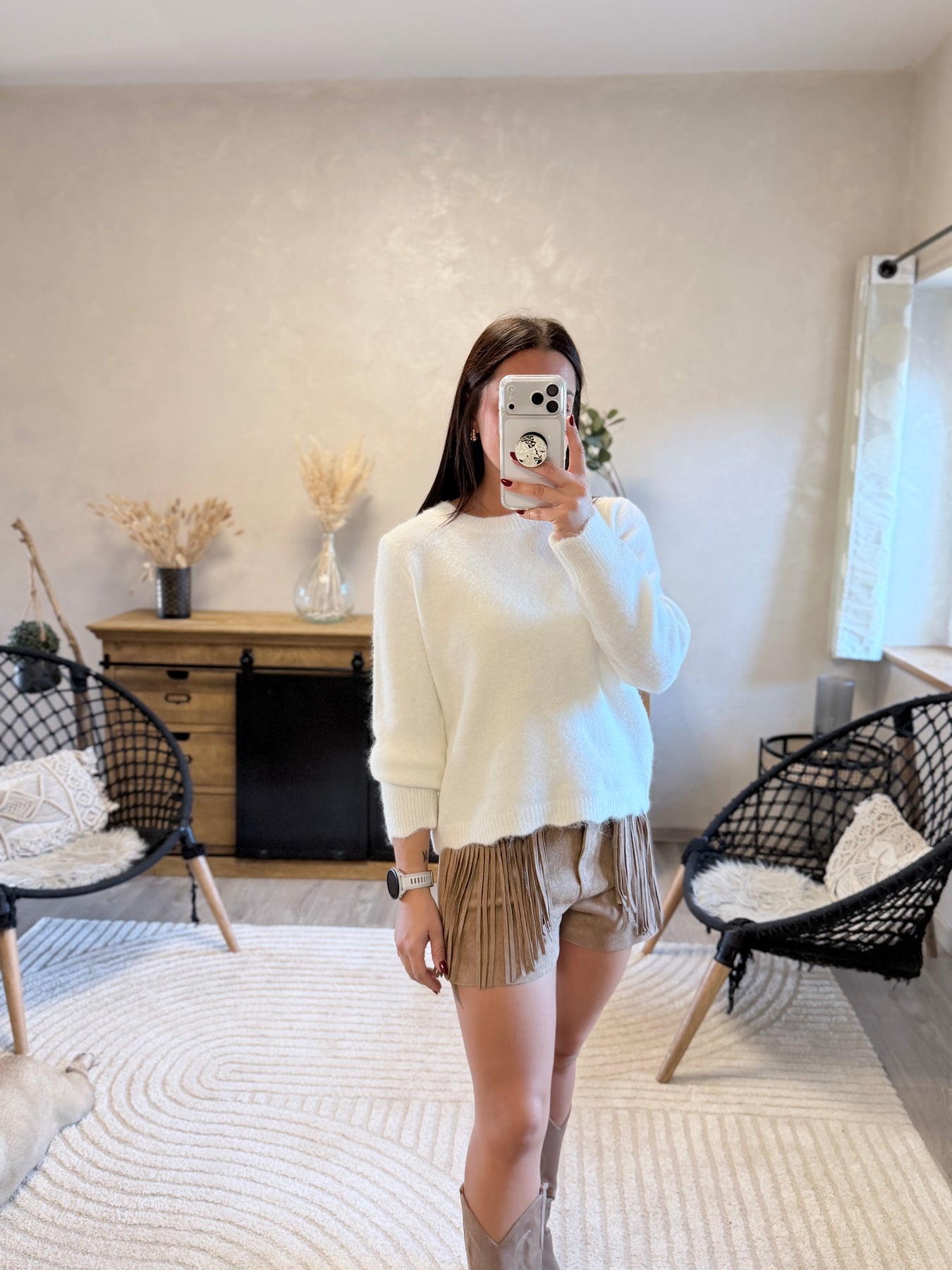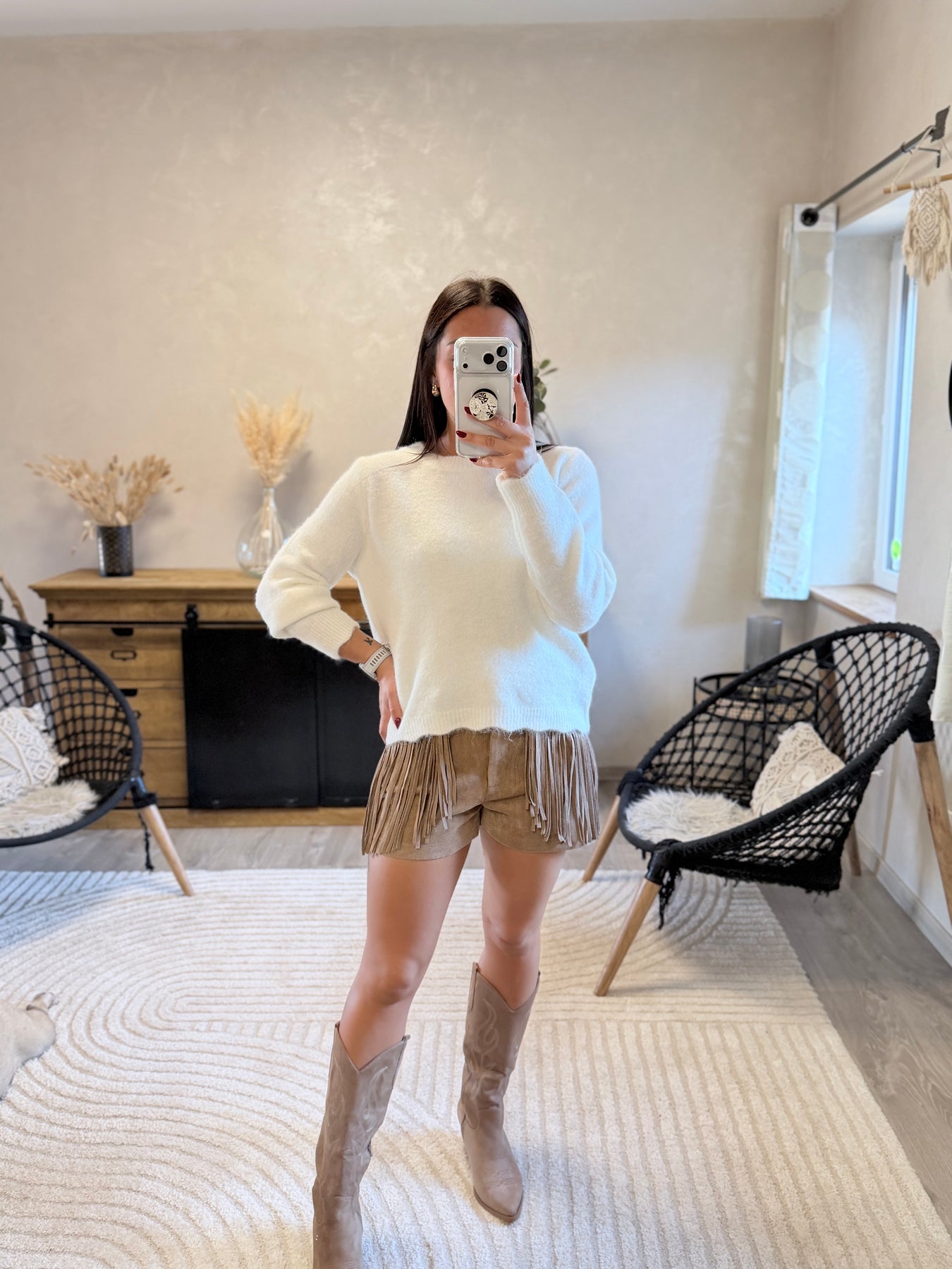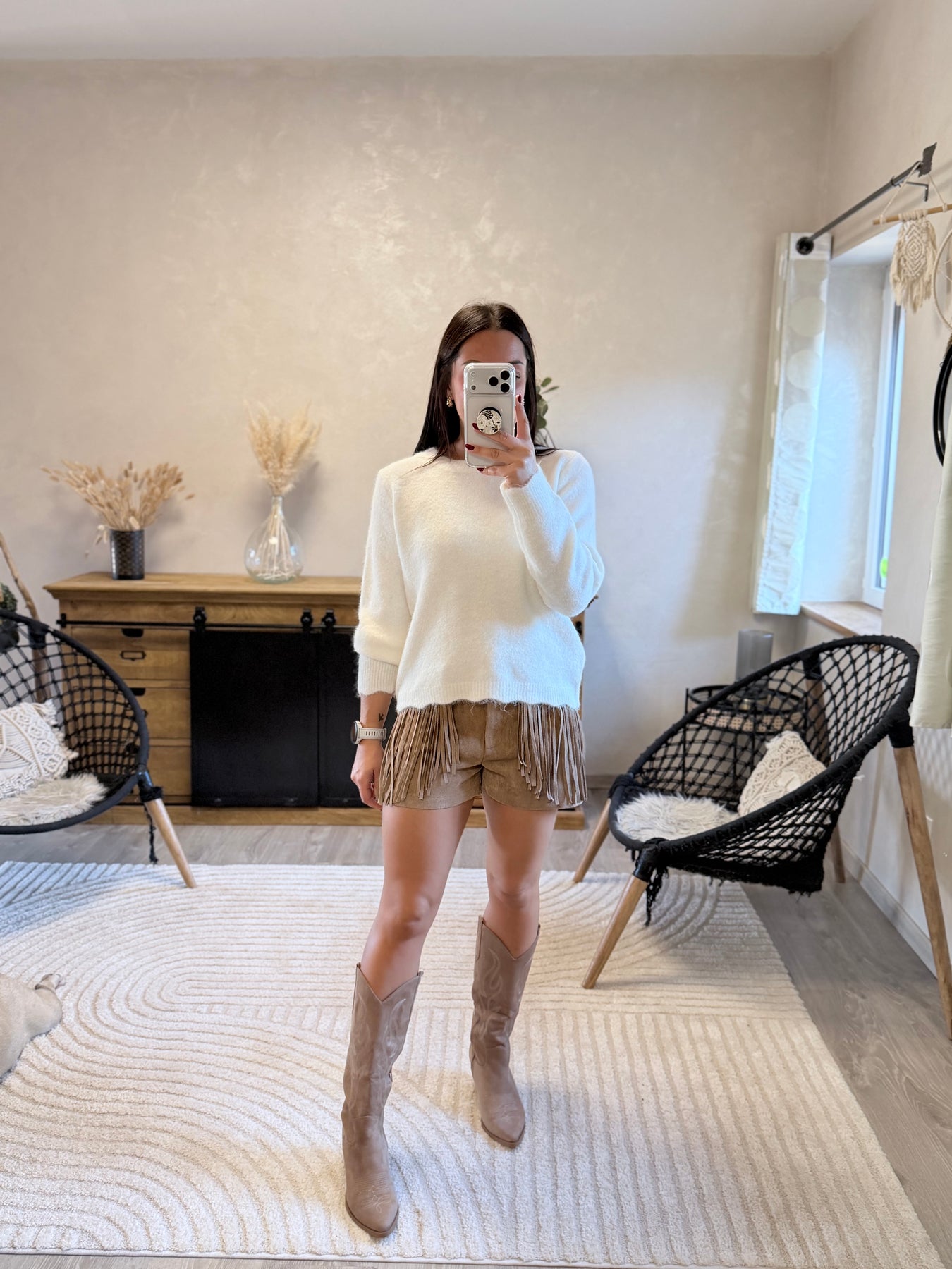 Look porté avec le short à franges “Mariah” et des bottes beiges pour un style bohème chic.