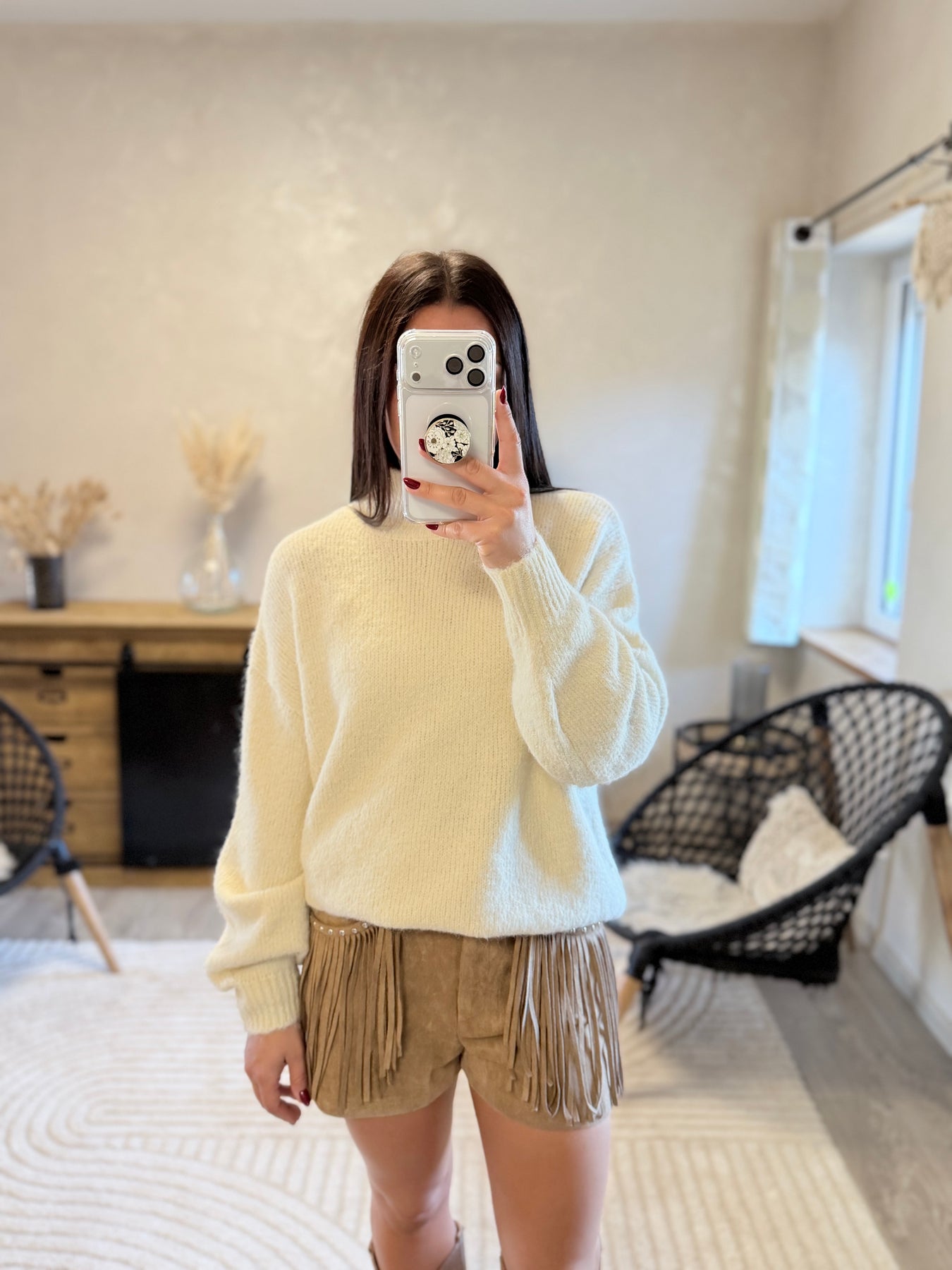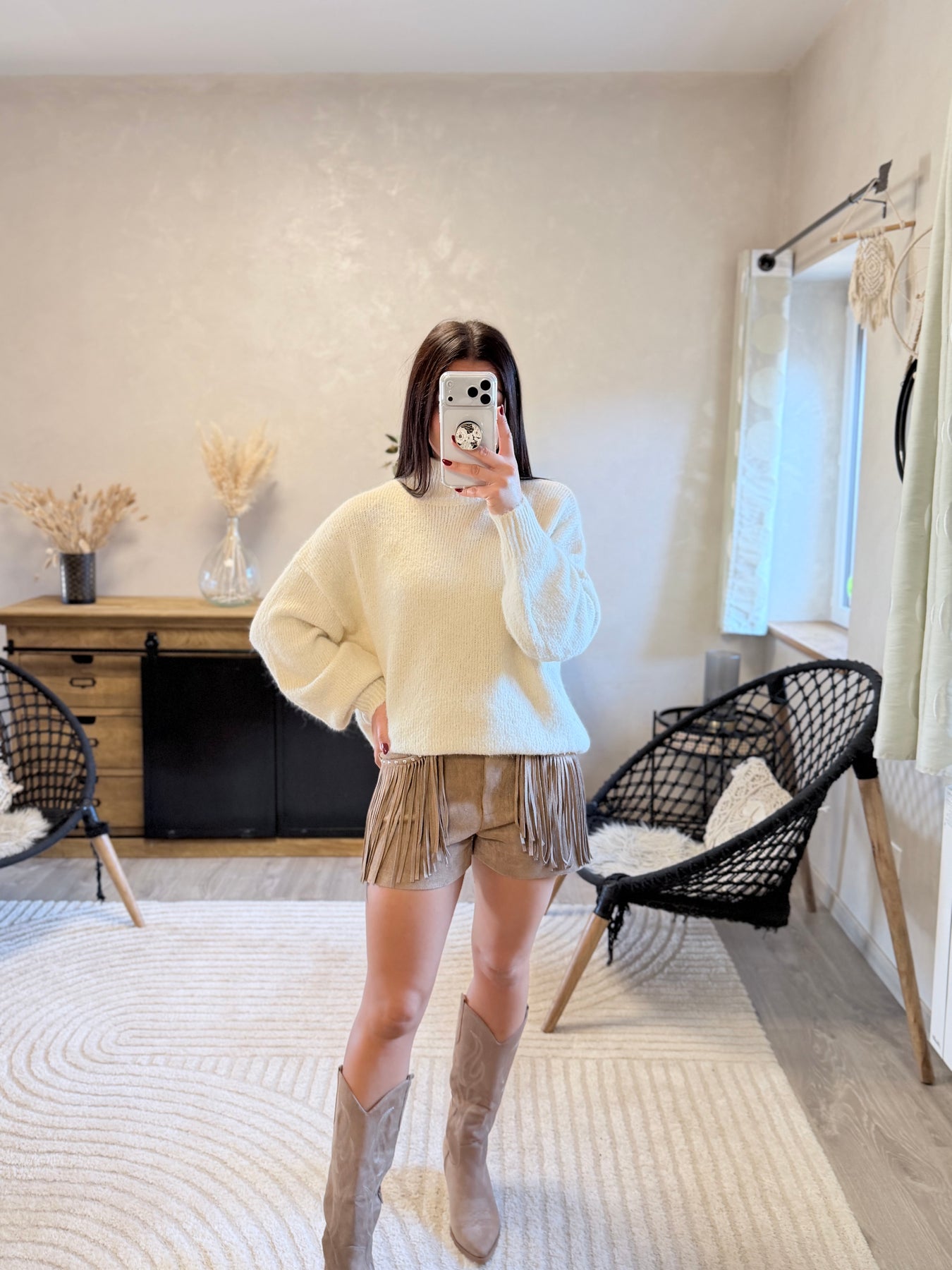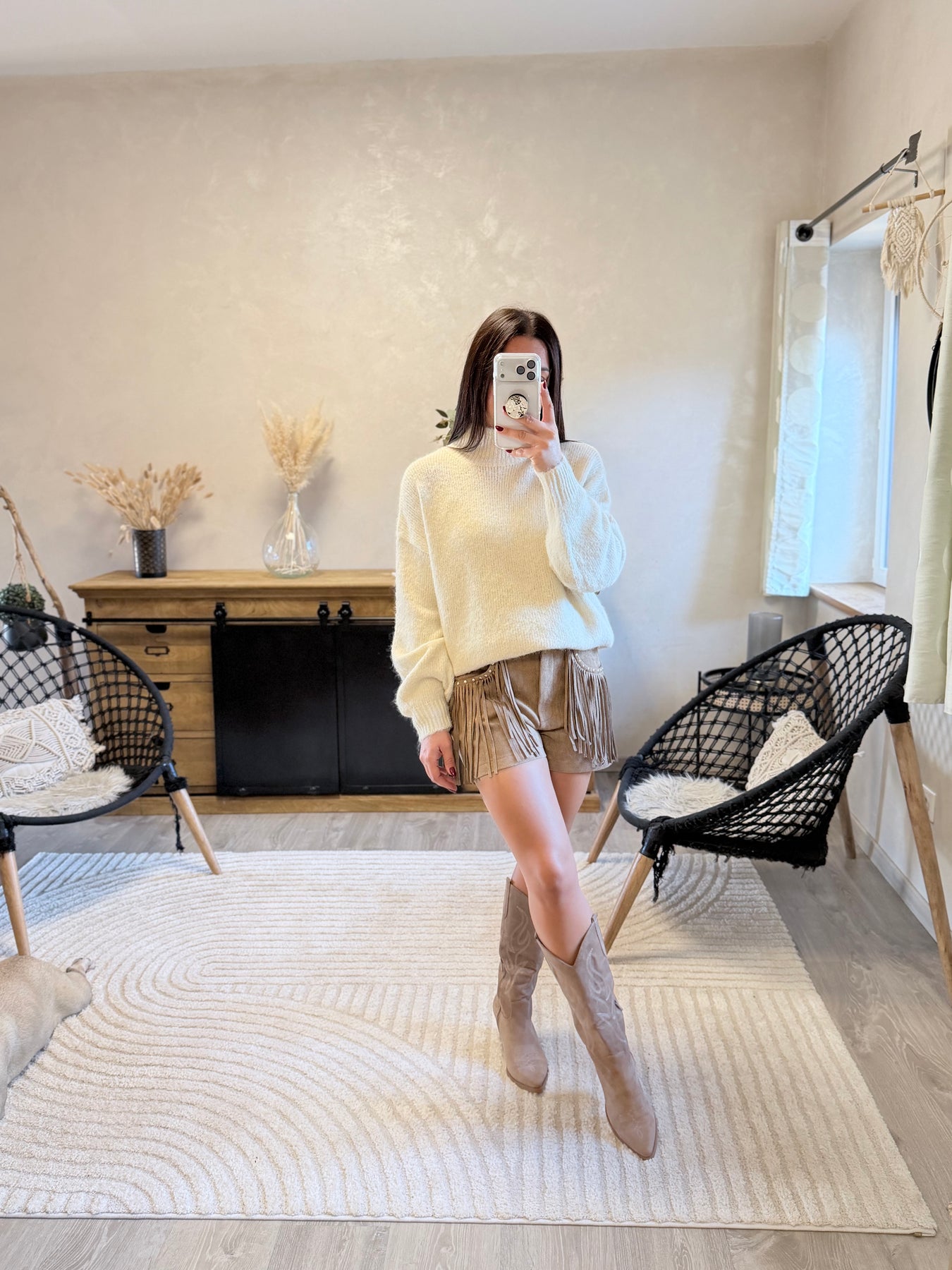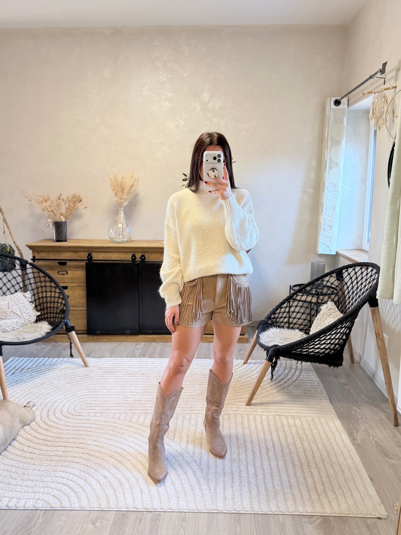 Look porté avec le short à franges “Mariah” et des bottes beiges western pour un style bohème automnal.