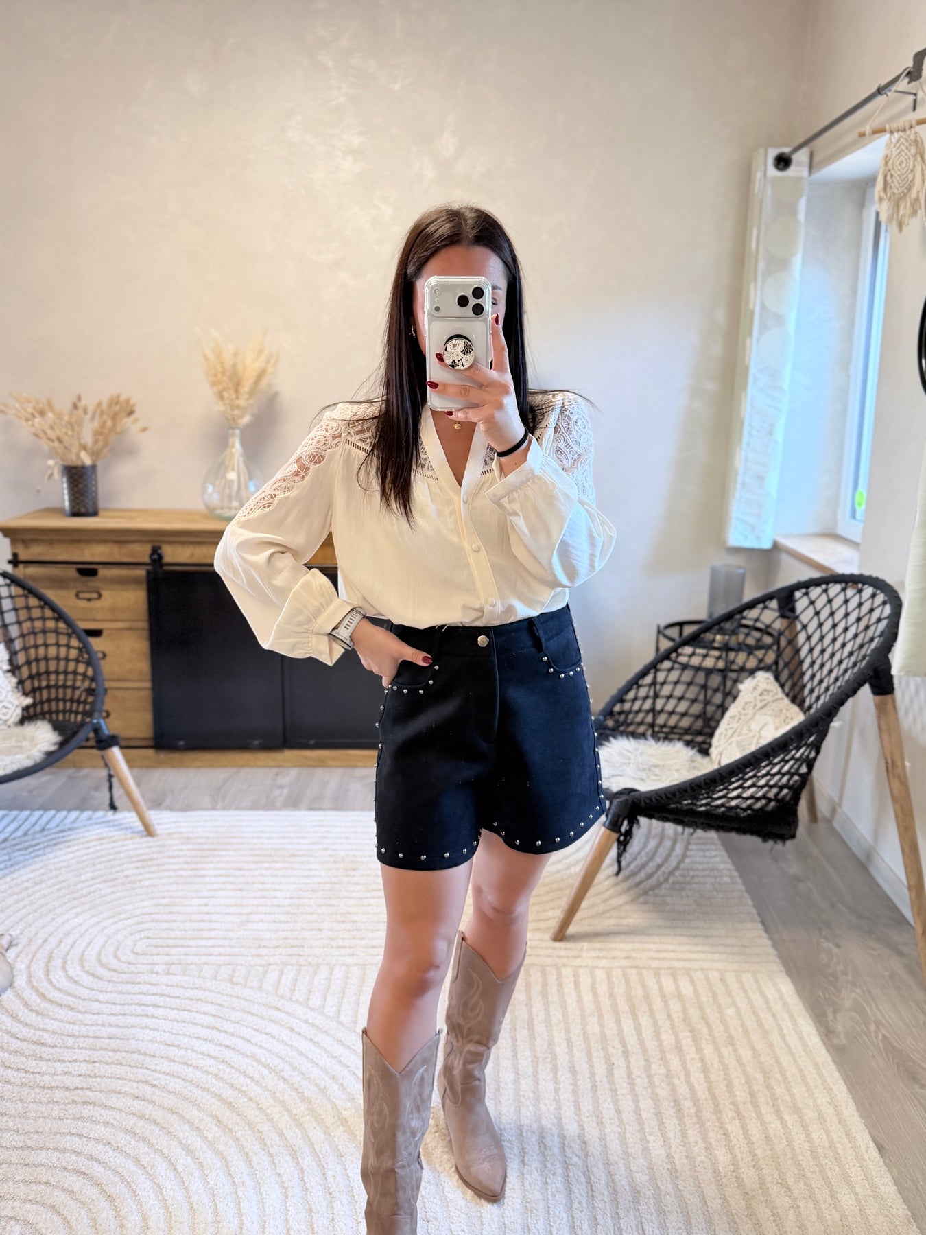 Alicia (1m57, porte du 36) présente ici le short Loric noir associé à la blouse Bony, pour un look western chic ultra-tendance.