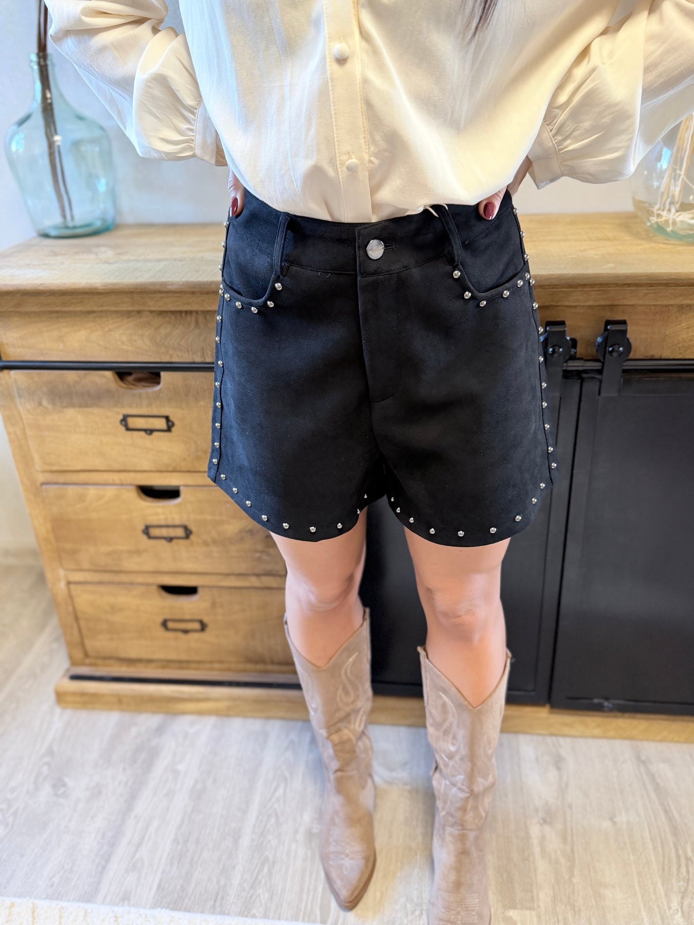 Le short Loric noir est une pièce forte du dressing automnal 🤎. Sa matière suédine lui confère un toucher doux et raffiné, tandis que ses clous argentés apportent une touche rock subtile. Parfait avec une blouse fluide ou un pull près du corps pour un look moderne et féminin ✨.