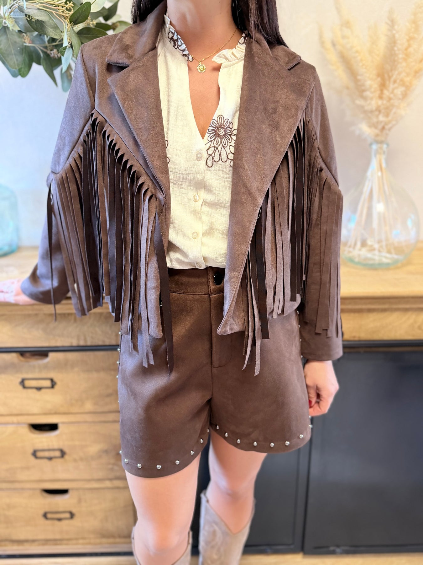 Alicia (1m57, porte habituellement du 36) présente ici la veste Franges Choco associée à la chemise Noemy et au short Loric, pour un look western moderne et féminin.