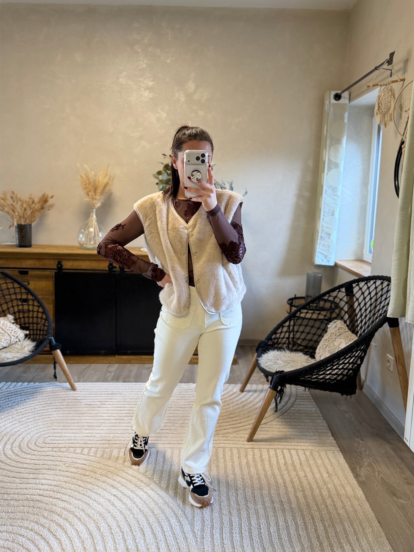 Alicia mesure 1m57 et porte la taille SM, associée au top Nelson chocolat et au jean beige pour un look automnal tendance 🍂