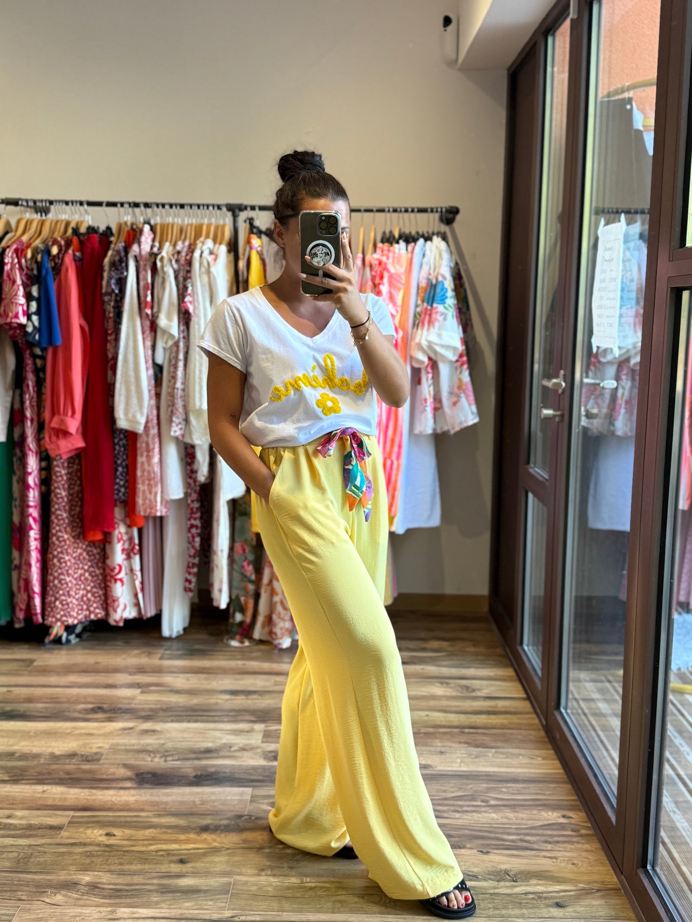 2️⃣ Mannequin Alicia : 1m57, porte le tee-shirt “Bohème” avec le pantalon “Eliam” jaune.