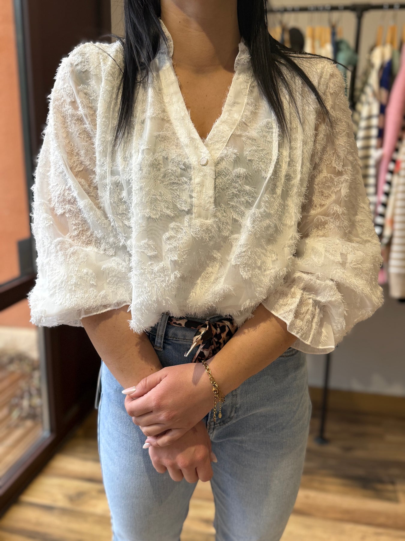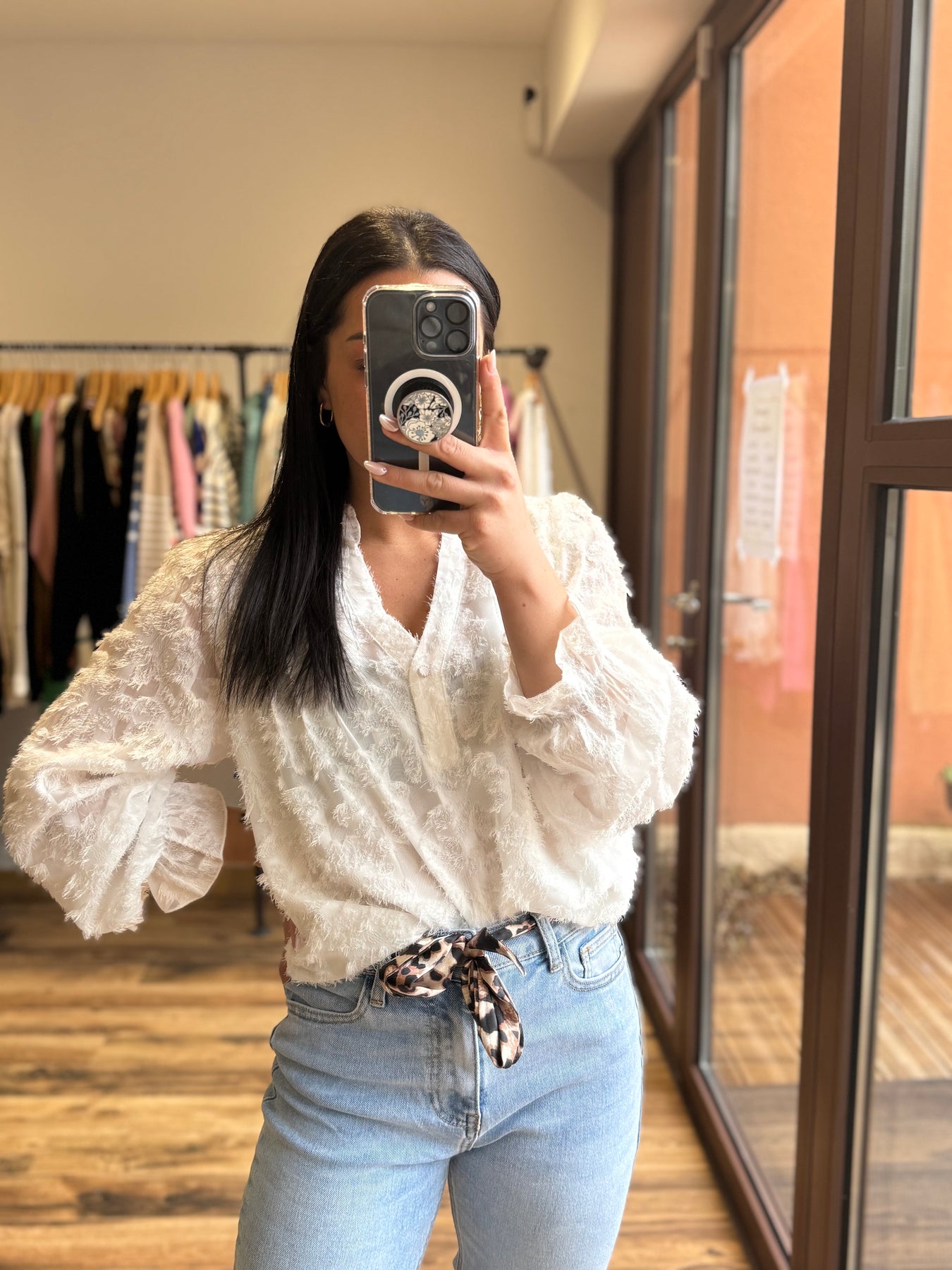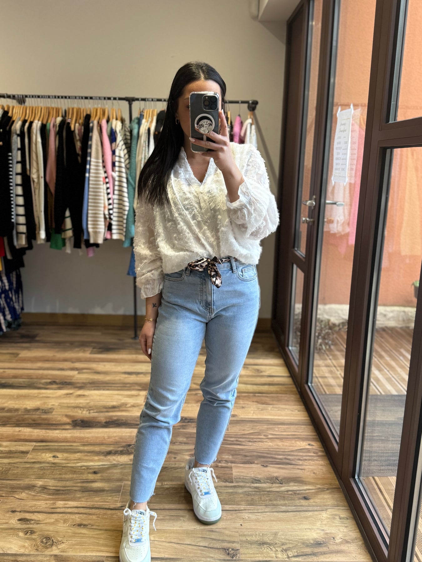 Alicia mesure 1m57 et met du 36 elle porte la blouse avec
