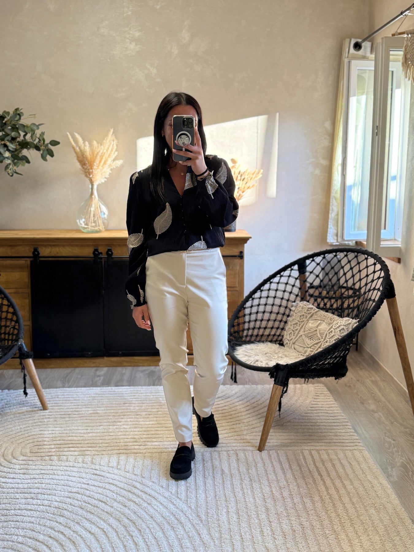 La blouse Lofty, c’est la pièce élégante et originale qui fait toute la différence 🌙. Son tissu fluide et ses broderies argentées apportent une touche festive et raffinée, parfaite pour un look de bureau stylé ou une soirée chic. Avec le pantalon Tino beige, on obtient un contraste moderne et sophistiqué. Elle se porte aussi avec un jean noir ou une jupe pour varier les styles ✨.