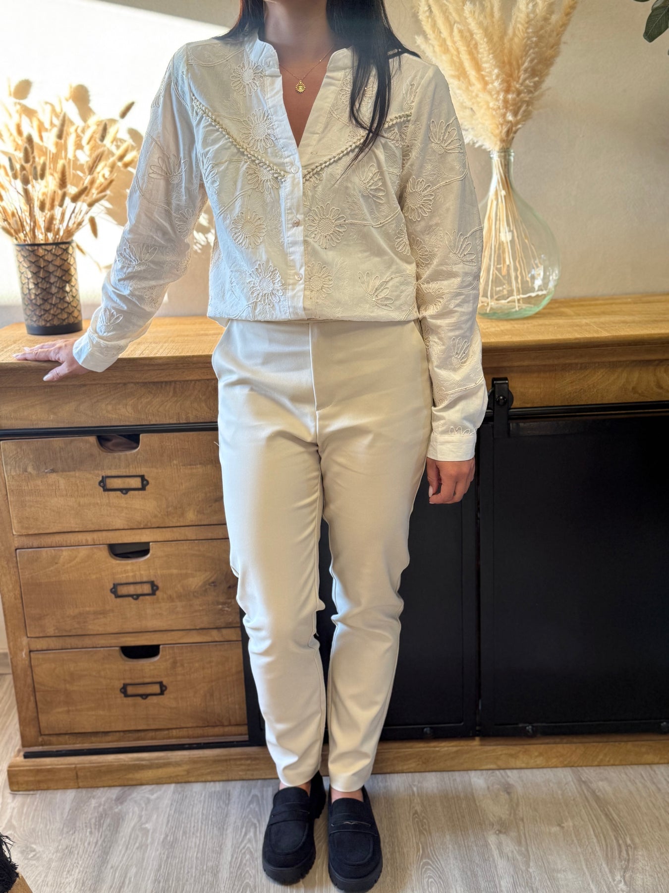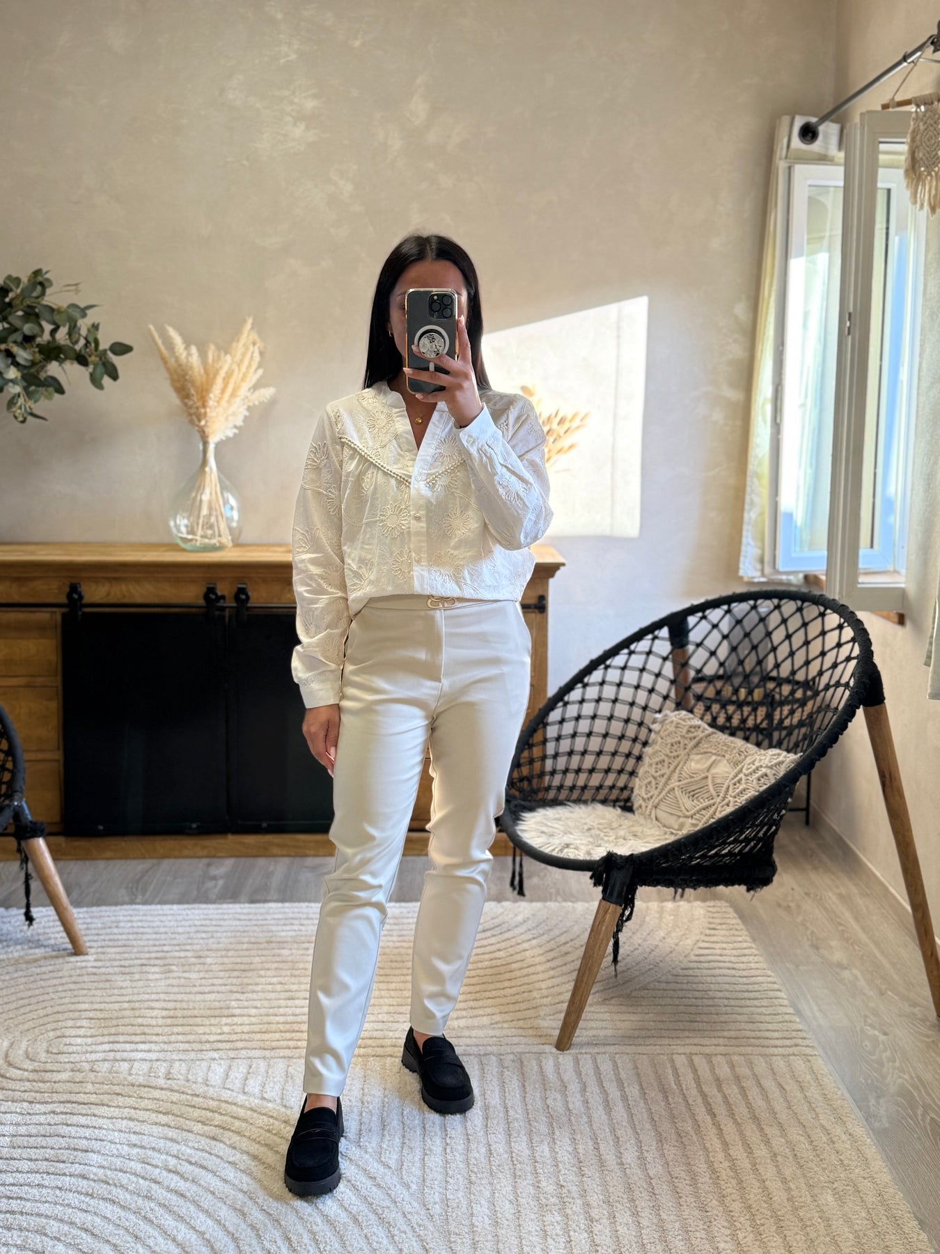 Une chemise romantique et raffinée 🌼. Ses broderies délicates apportent une touche bohème chic, parfaite pour illuminer un look. Associée au pantalon Tino beige, on obtient une tenue douce et élégante, idéale pour le bureau ou une sortie printanière. Elle se porte aussi très bien avec un jean clair ou une jupe fluide pour varier les styles ✨.