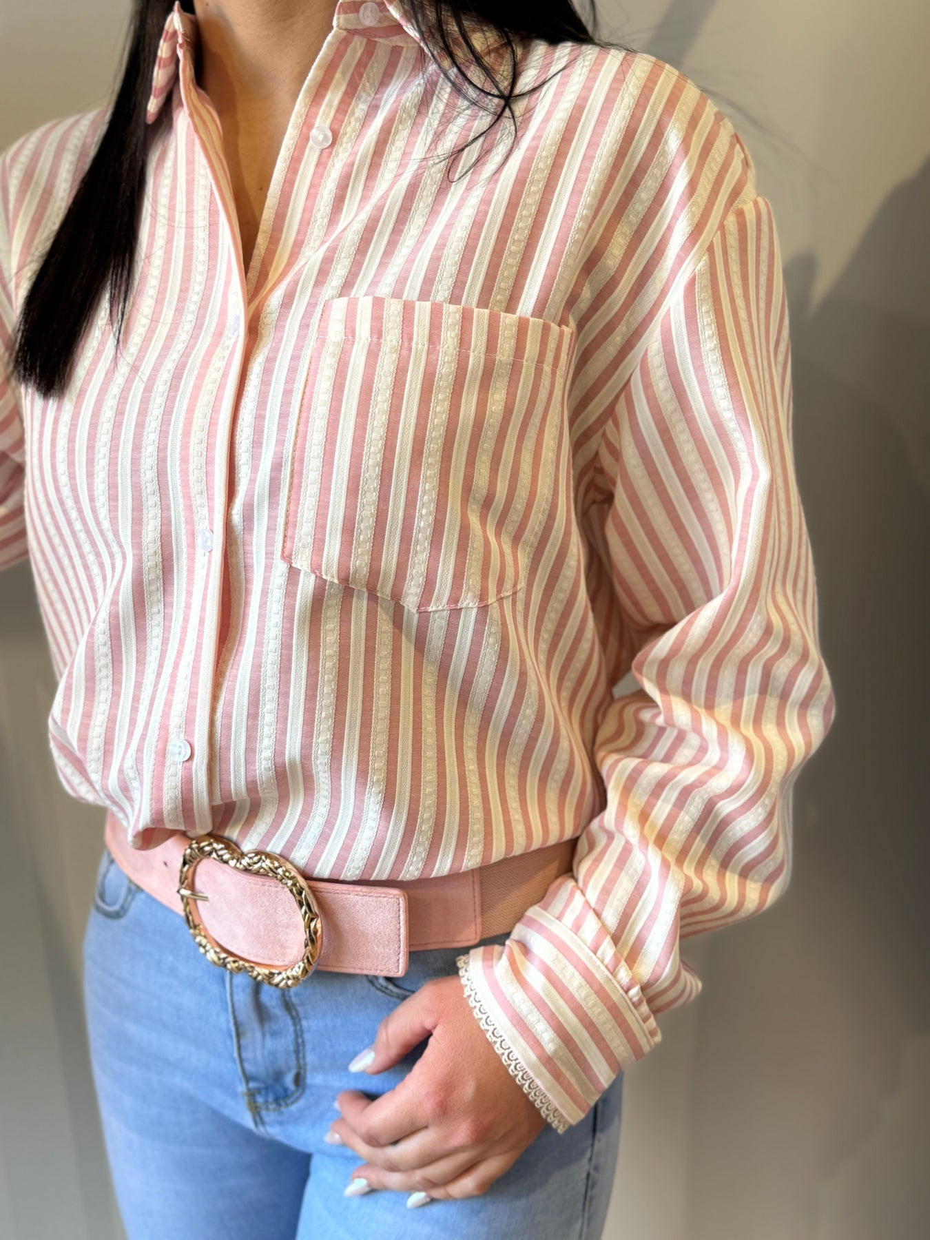 Alicia mesure 1m57 et met du 36 elle porte la chemise avec le jean Mandyse et la ceinture rose