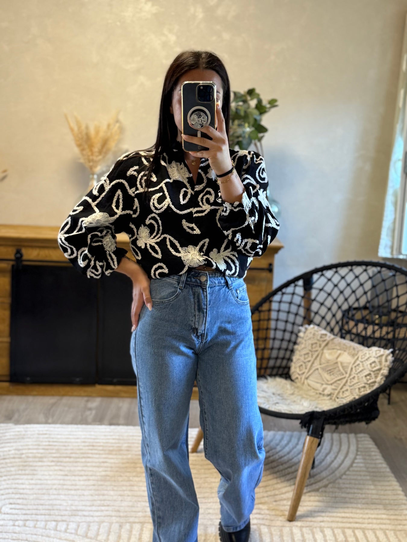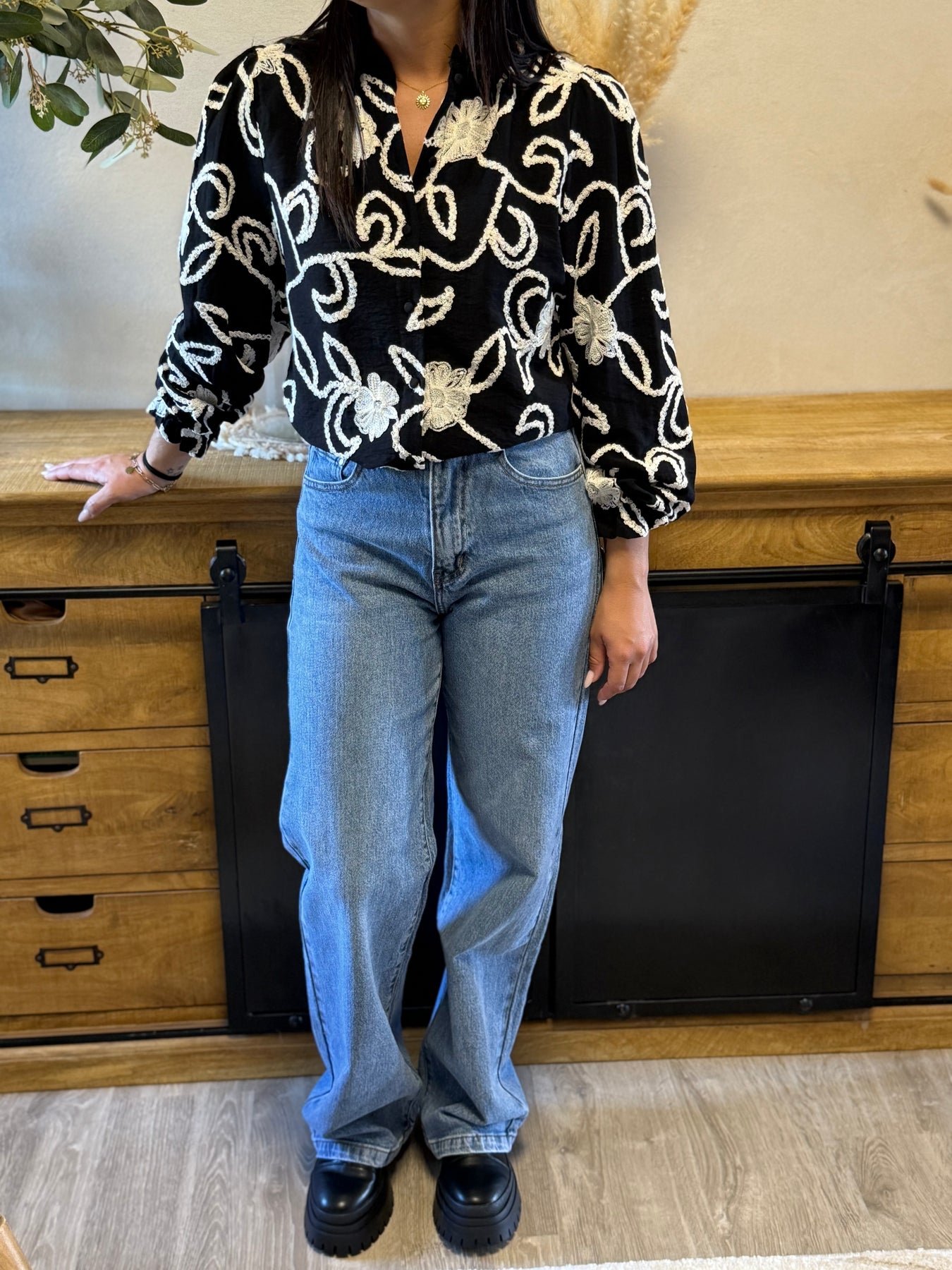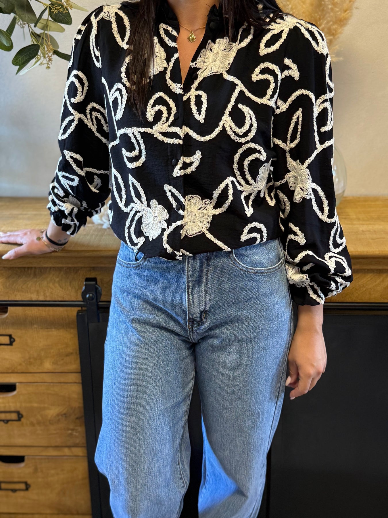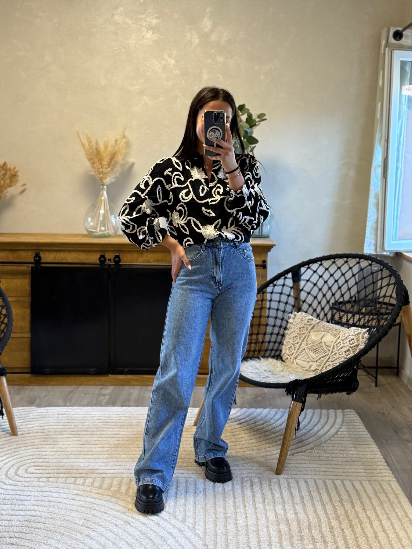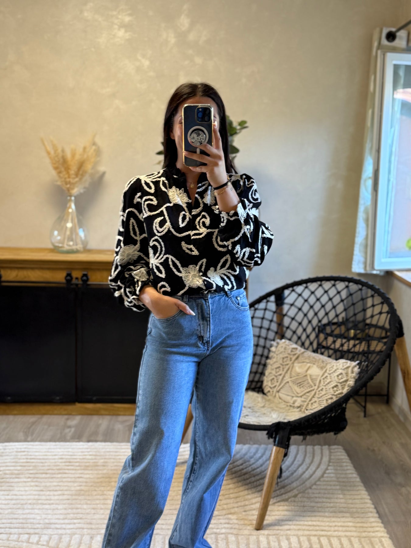 - Motifs brodés blancs sur fond noir pour un contraste chic