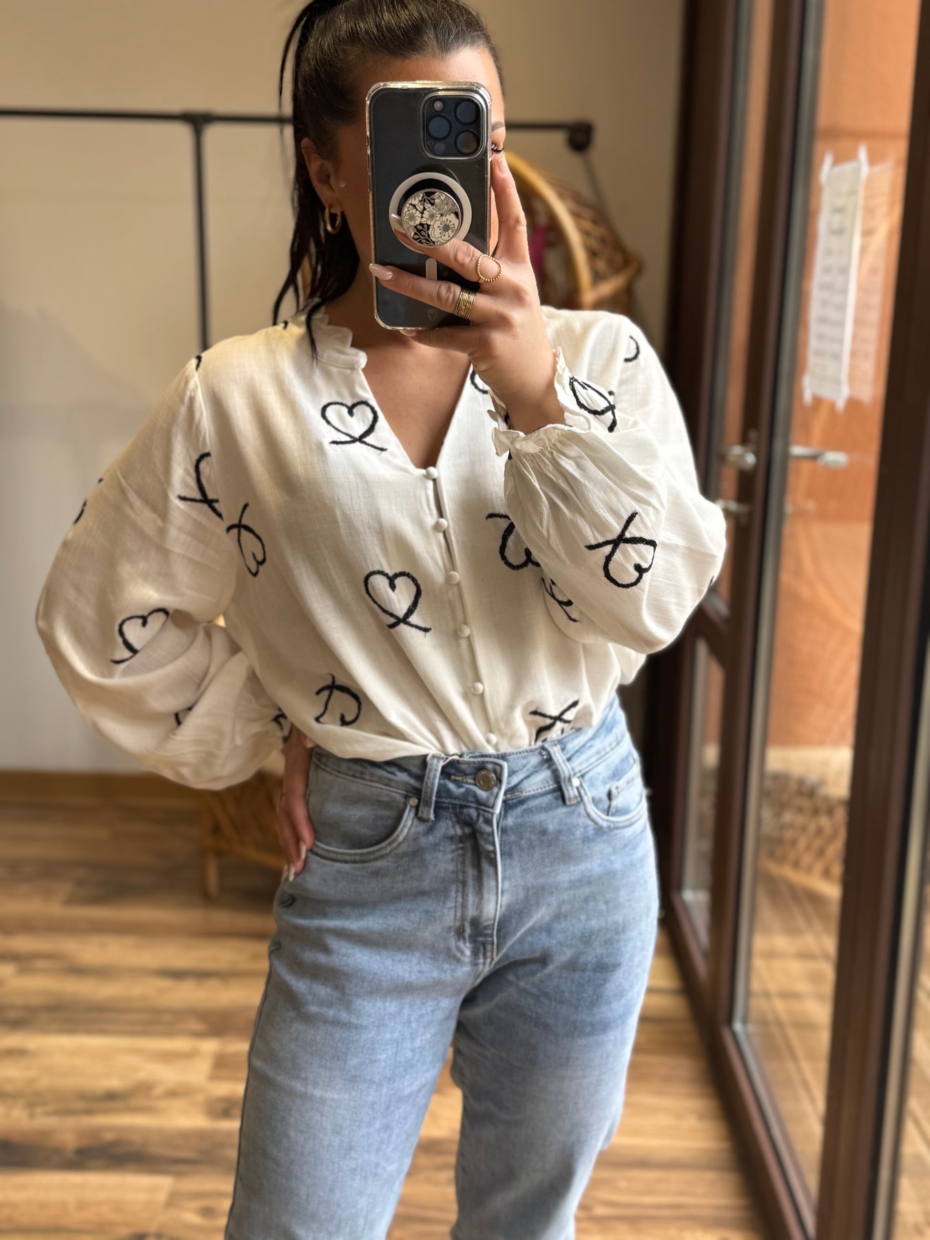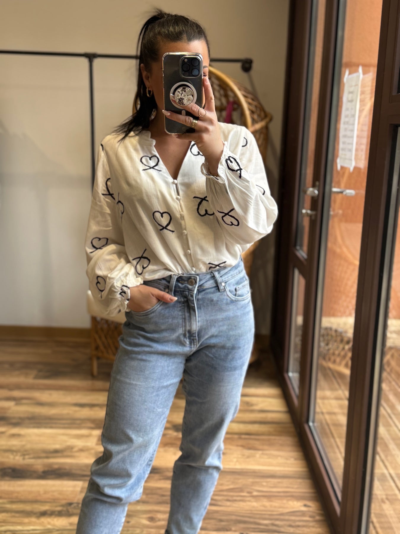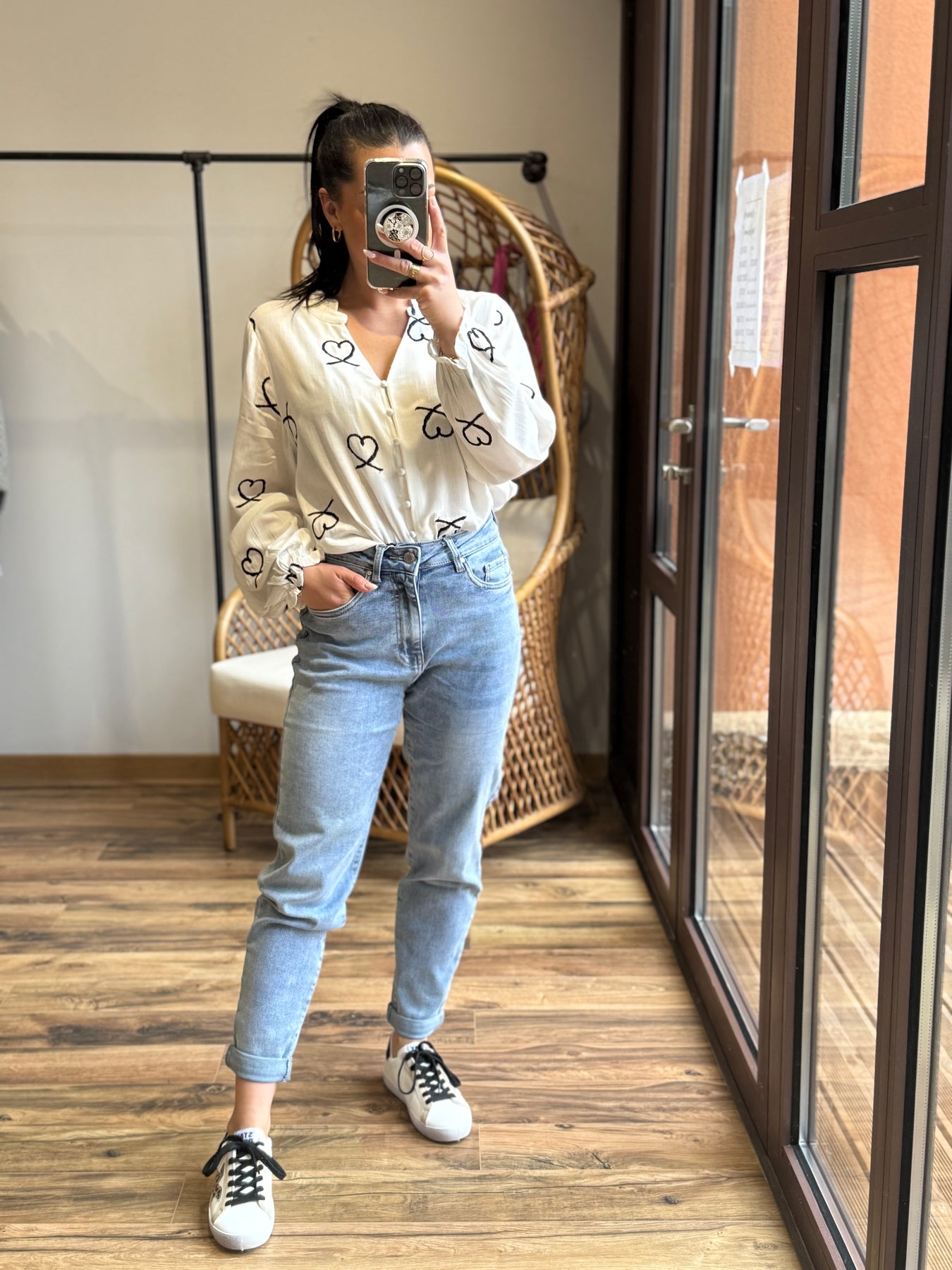 Alicia mesure 1m57 et met du 36 elle porte la chemise avec le jean mom Mathieu