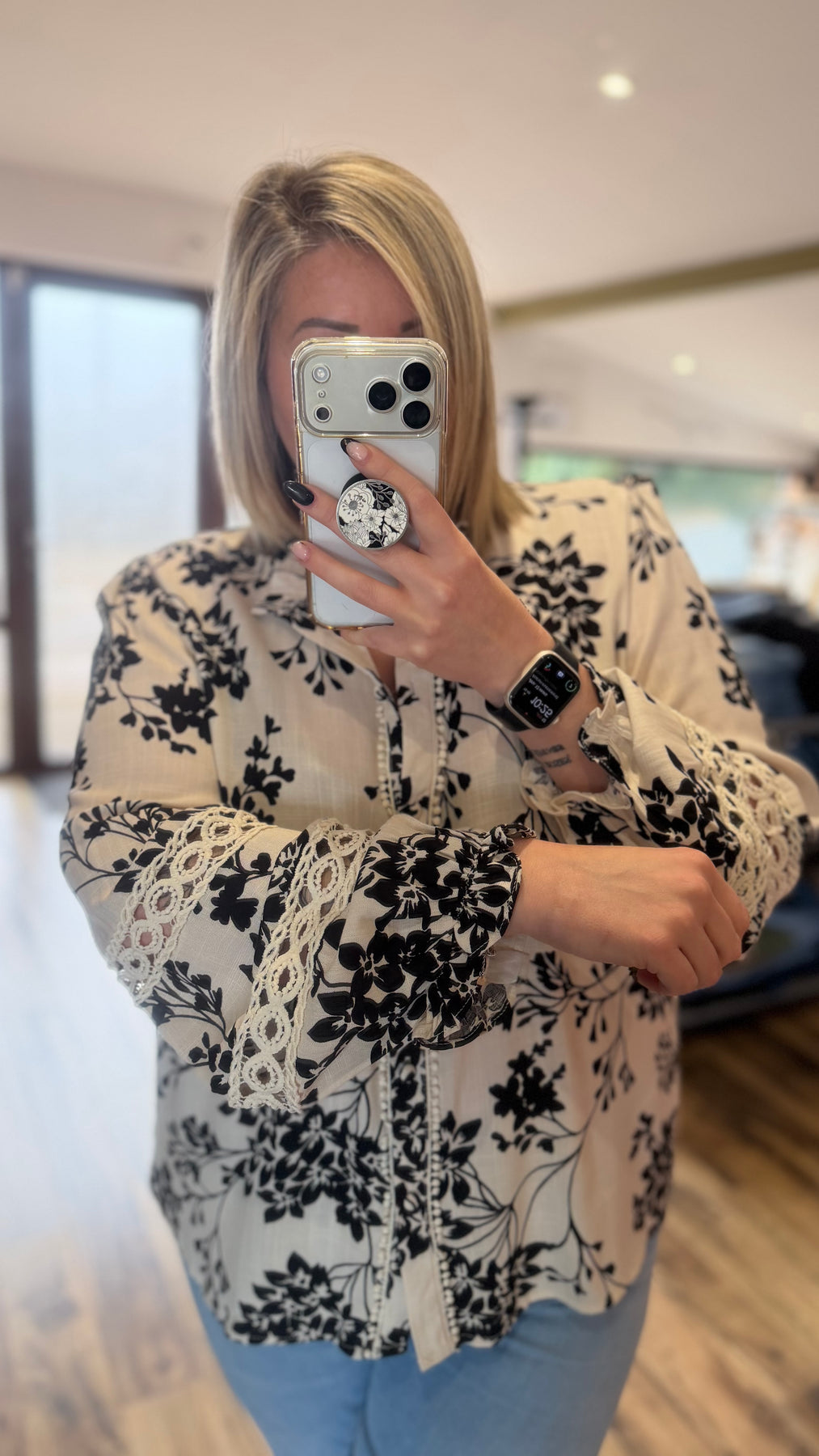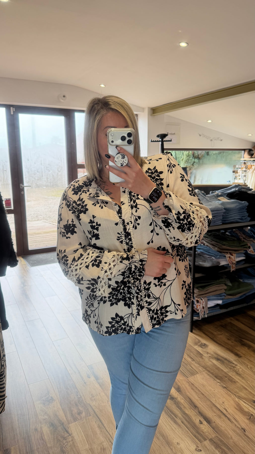 Une chemise élégante et féminine avec son imprimé floral noir intemporel et ses détails en dentelle délicats sur les manches. Elle se porte facilement avec une jupe ou un jean pour une tenue chic et raffinée.