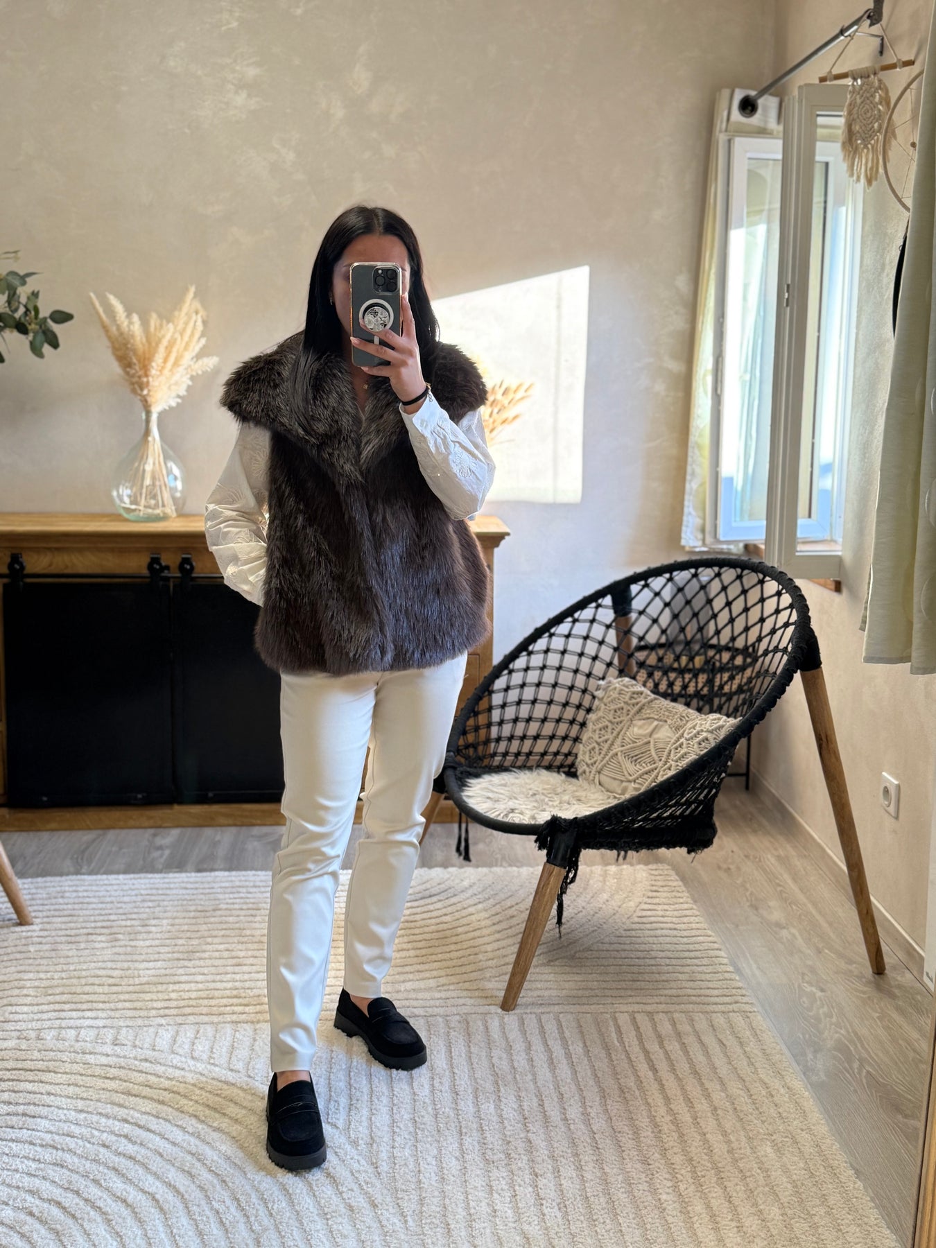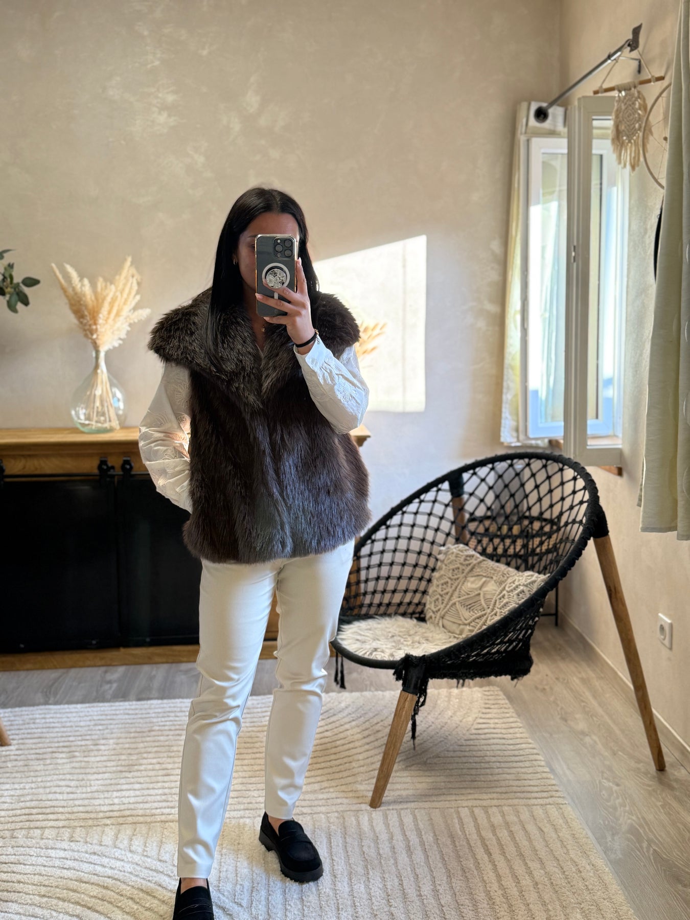 👗 Mannequin Alicia : mesure 1m57 et porte le gilet sans manches “Chocolat” associé à la chemise Alinéa (SM) et au pantalon Tino beige (S).