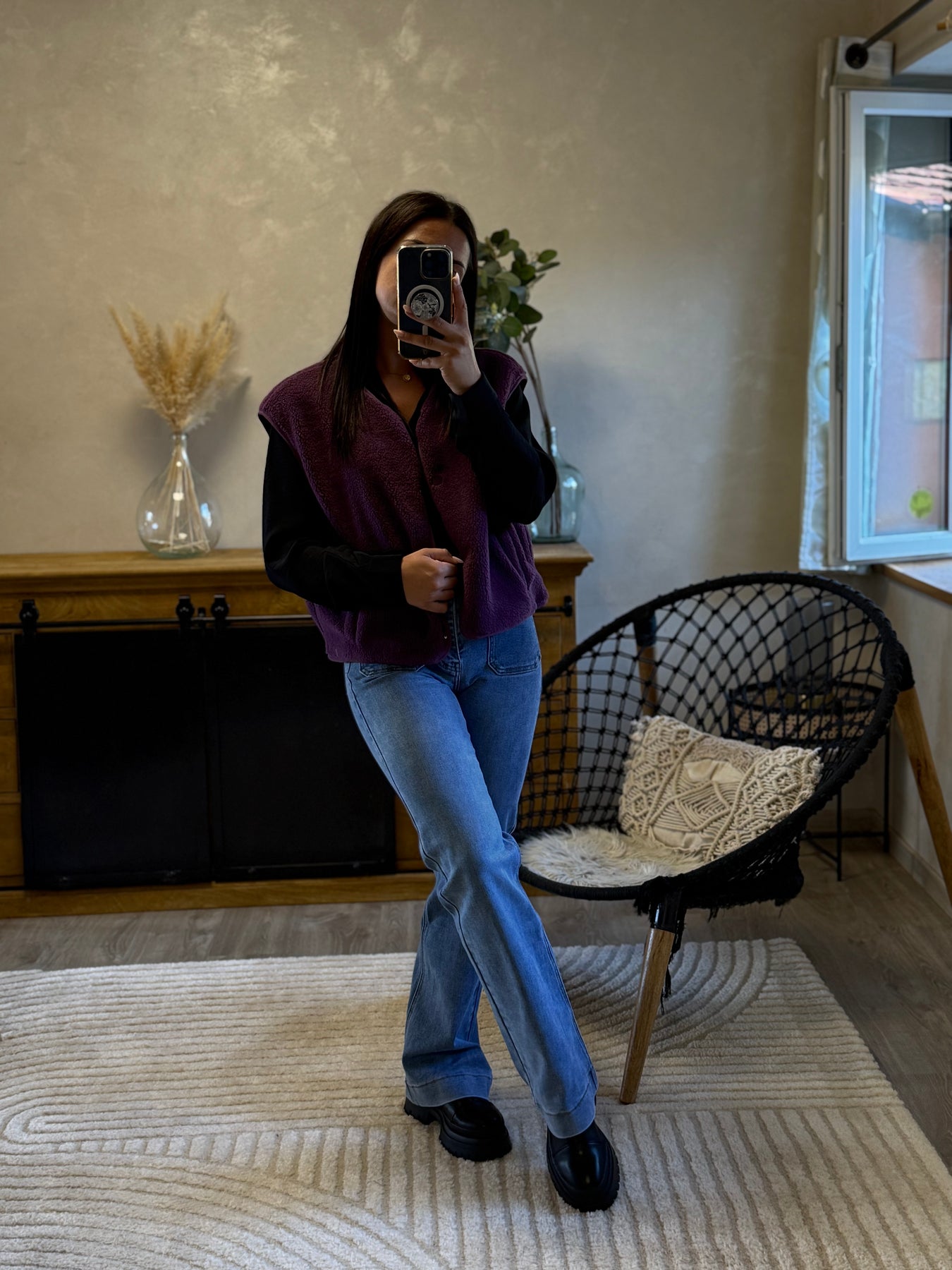 Alicia (1m57, porte du 36) présente ici le gilet Meryl prune associé à la chemise Sofiane noire et au jean Niko pour un look casual chic.