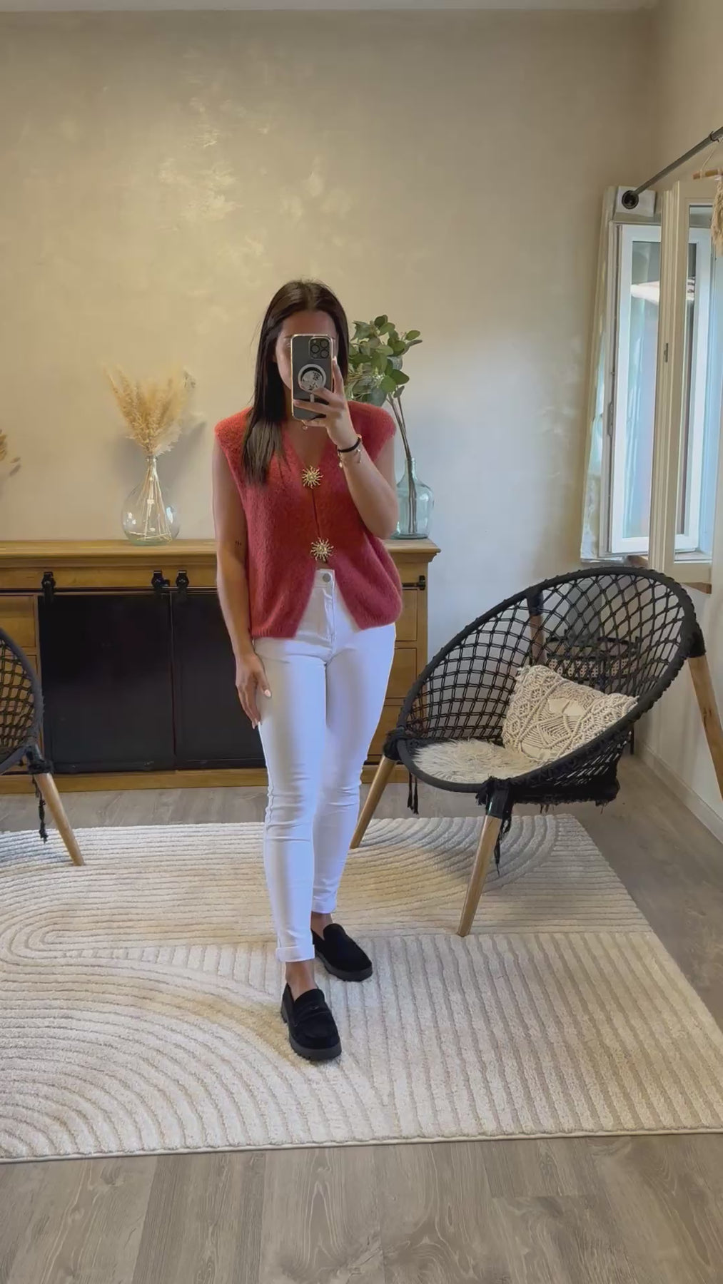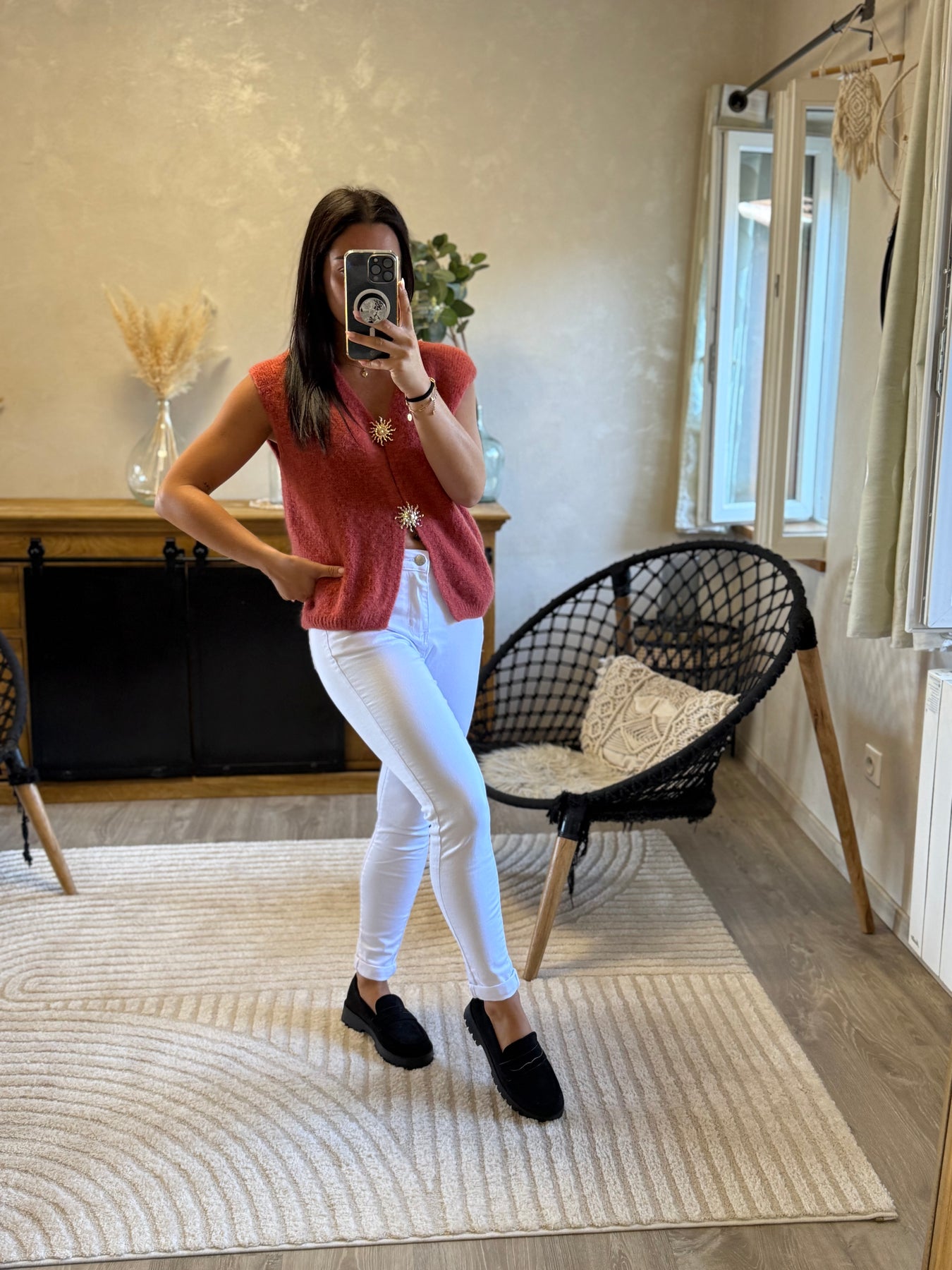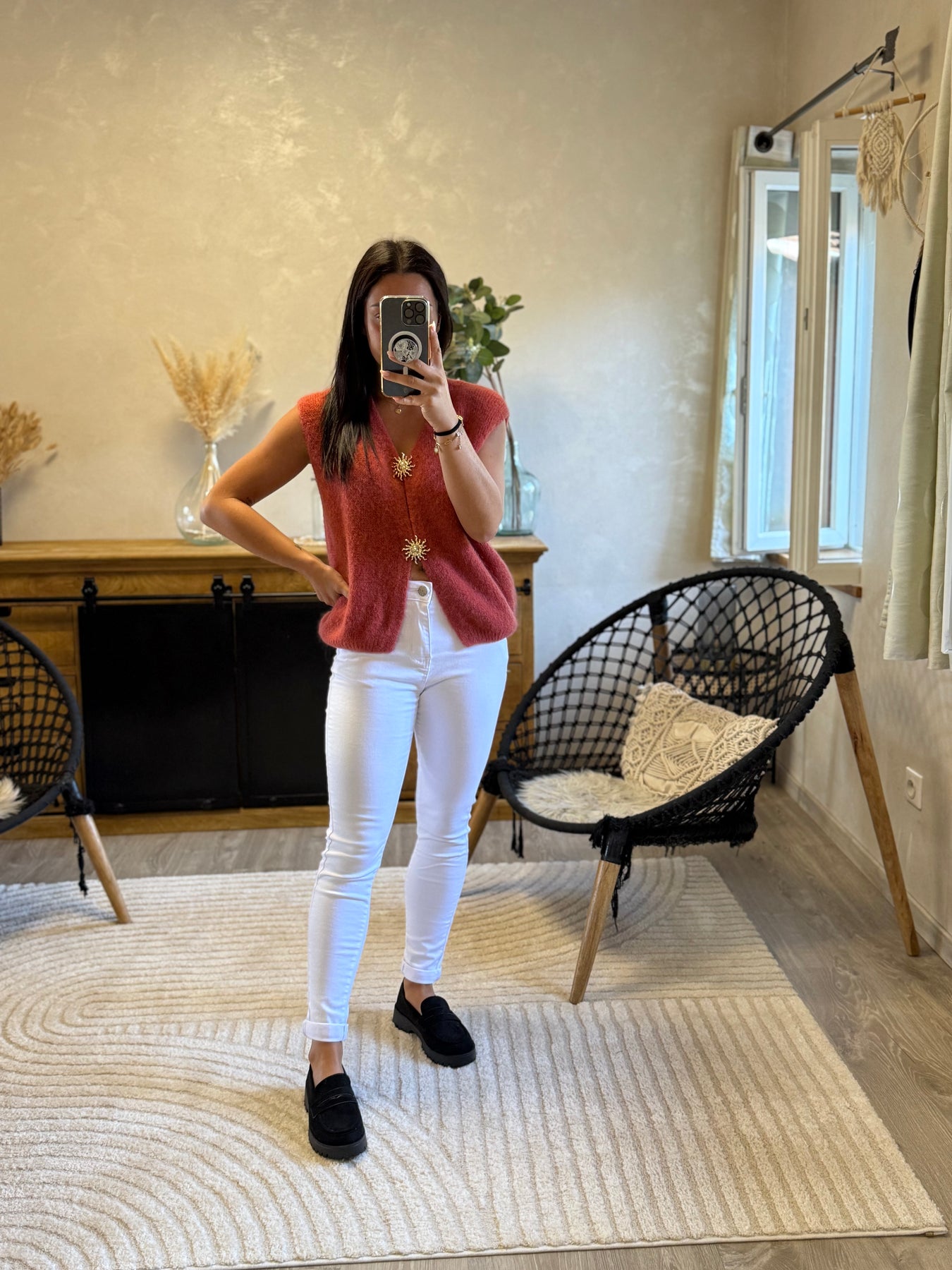 Ce gilet terracotta est la pièce qui réchauffe instantanément une tenue. Ses fermetures soleil dorées apportent une touche unique et élégante. On le porte aussi bien sur un jean blanc pour un look frais et printanier, que sur un pantalon noir ou une jupe pour un style plus sophistiqué.