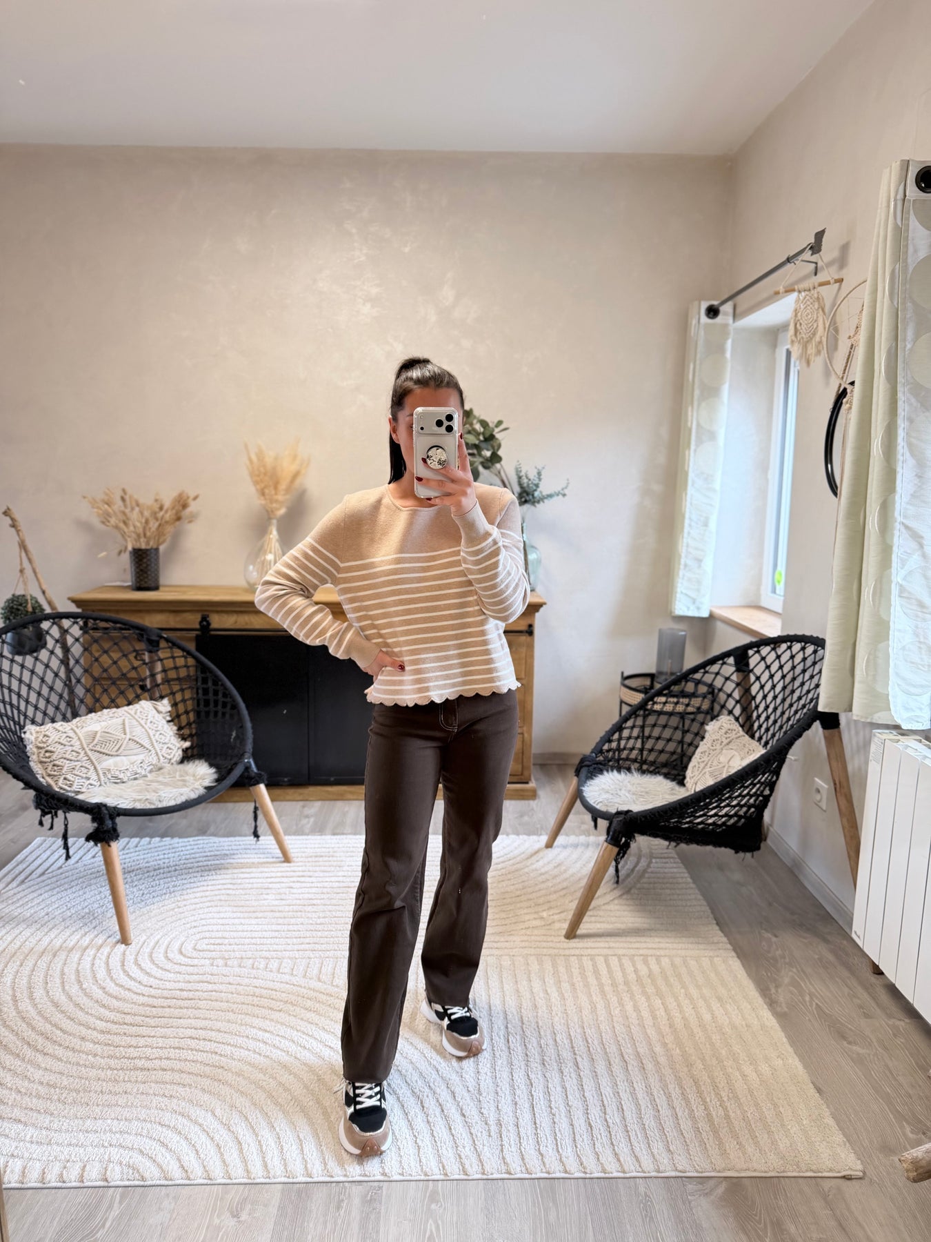 Look porté avec le pull “FAO beige” et des baskets noires et beiges.