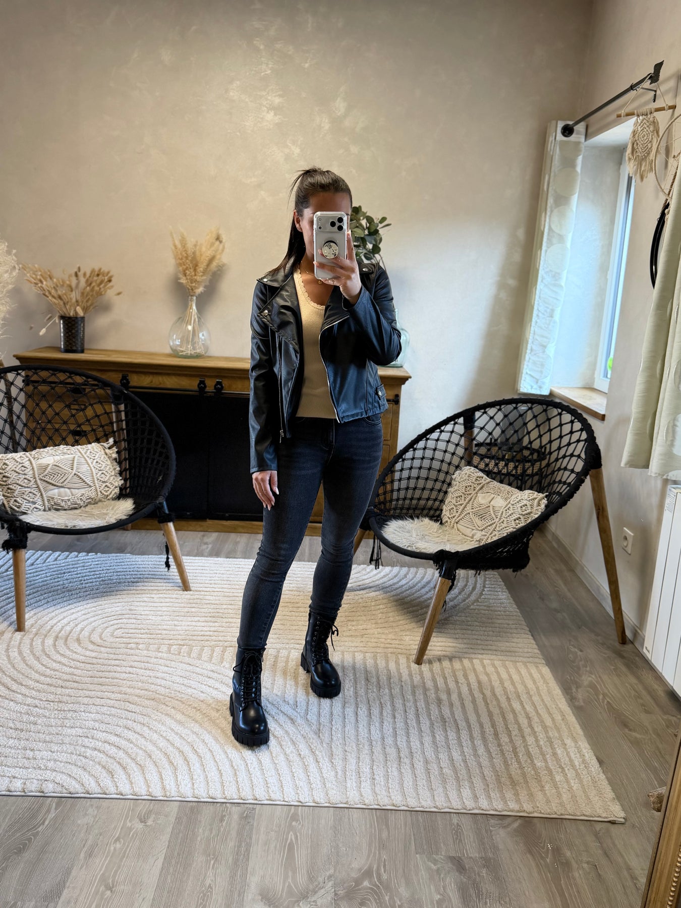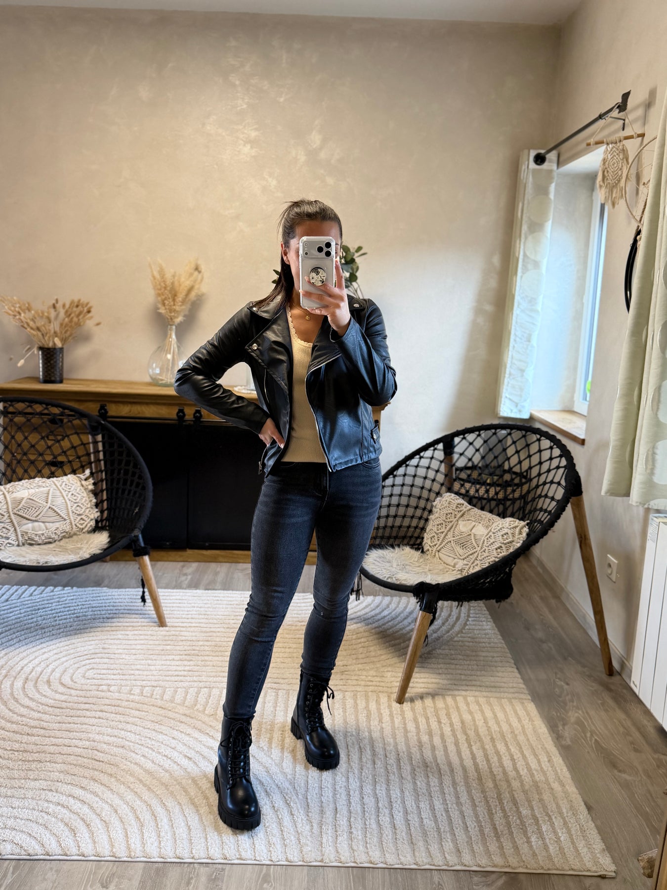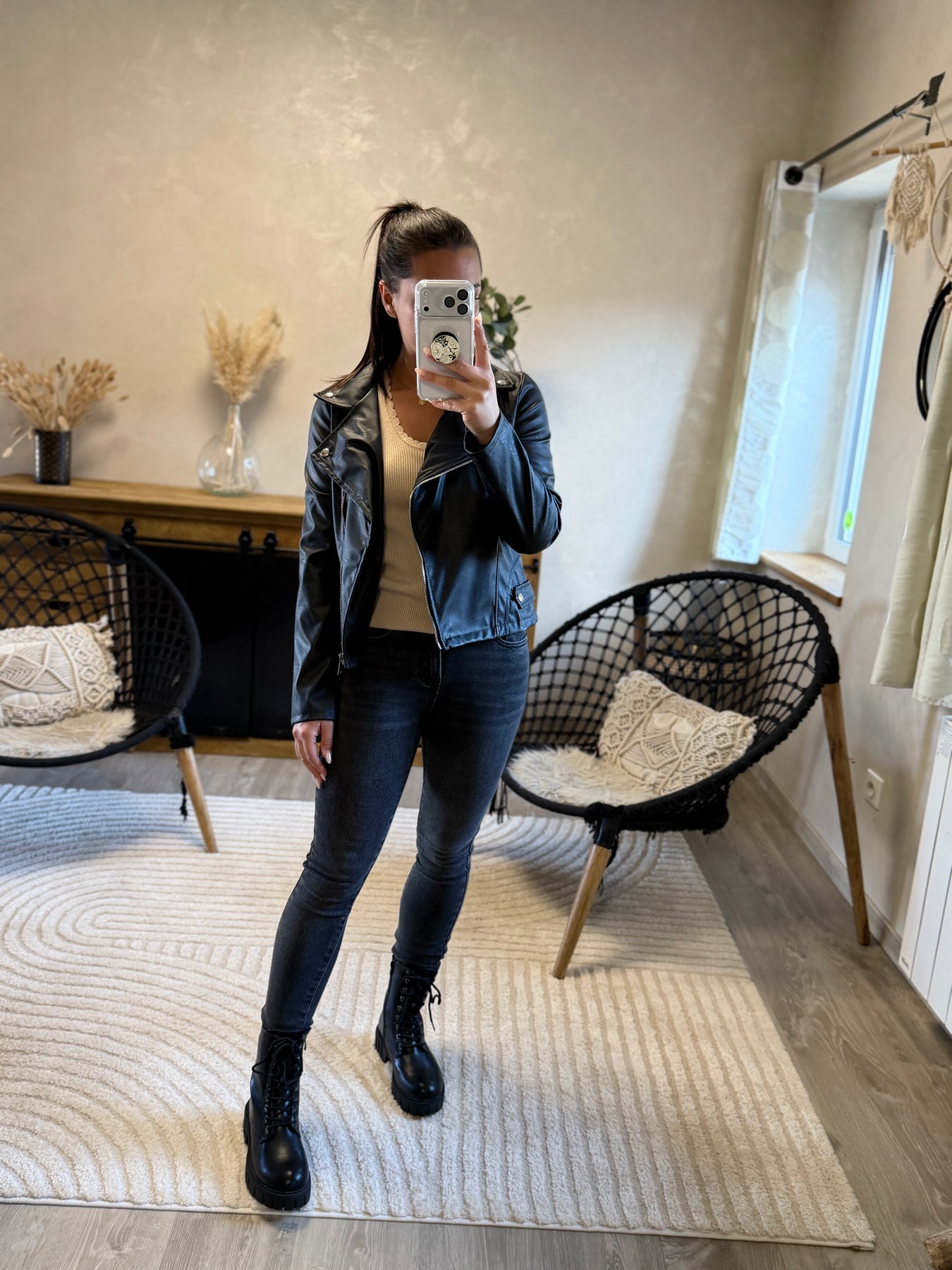 Alicia (1m57, porte du 36) présente ici le jean slim Apo associé au pull fin Aragone et à la veste Marthe noire pour un look moderne et élégant.