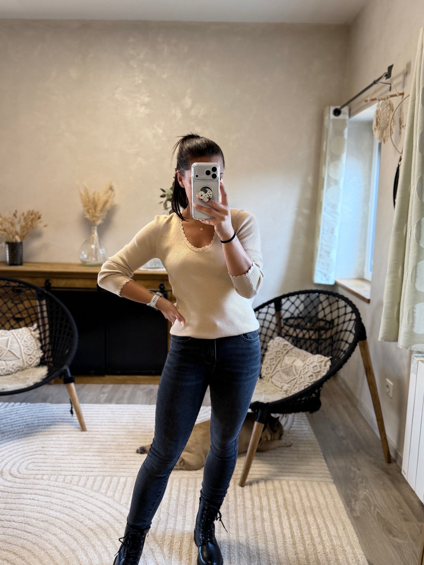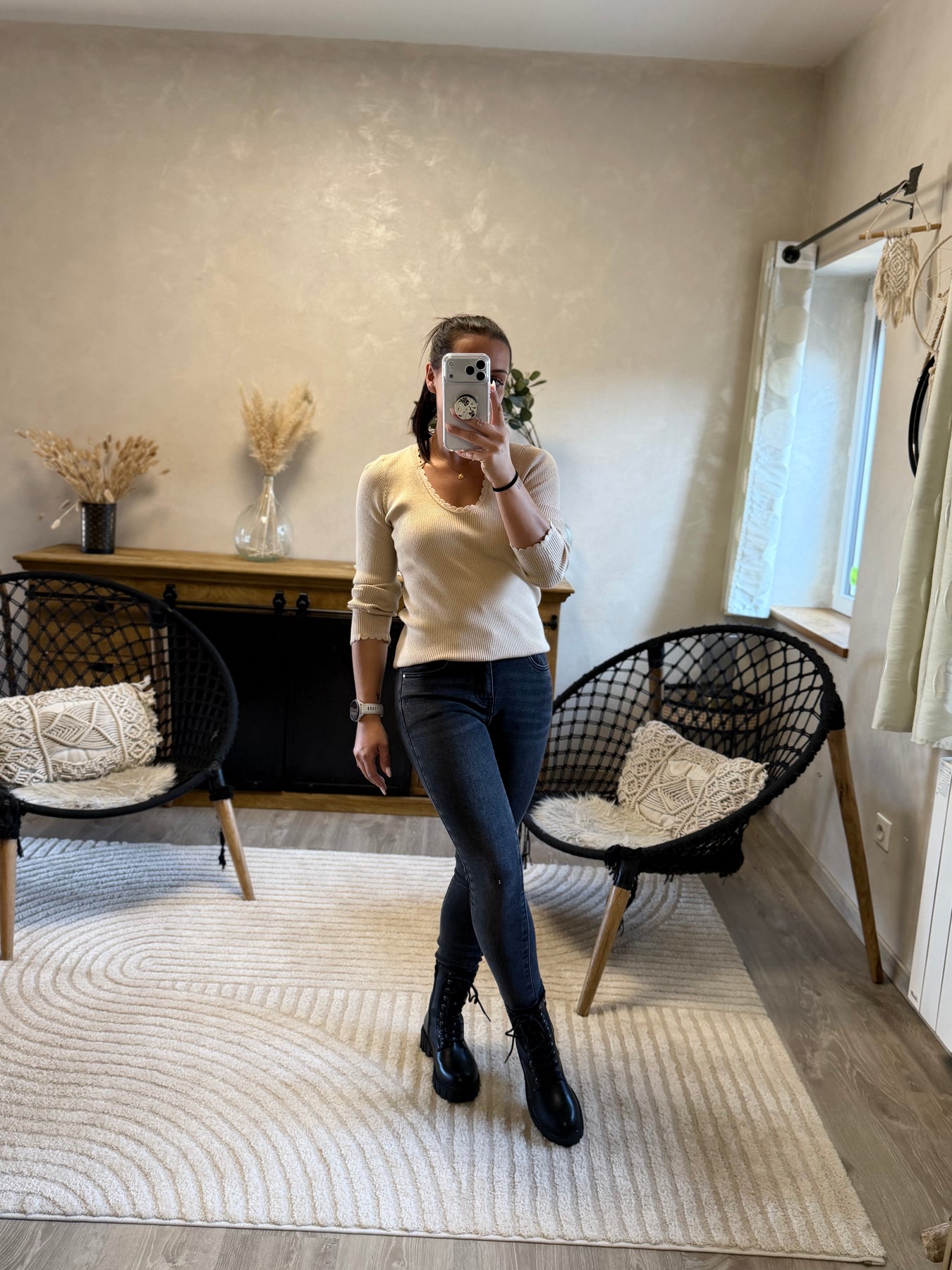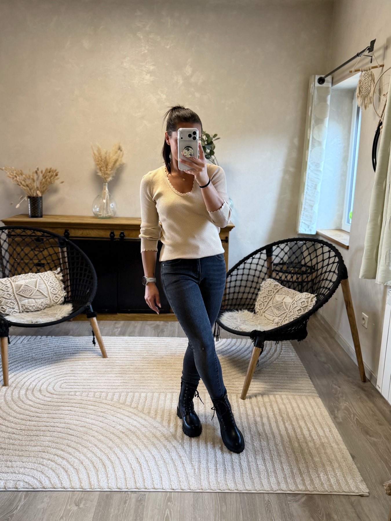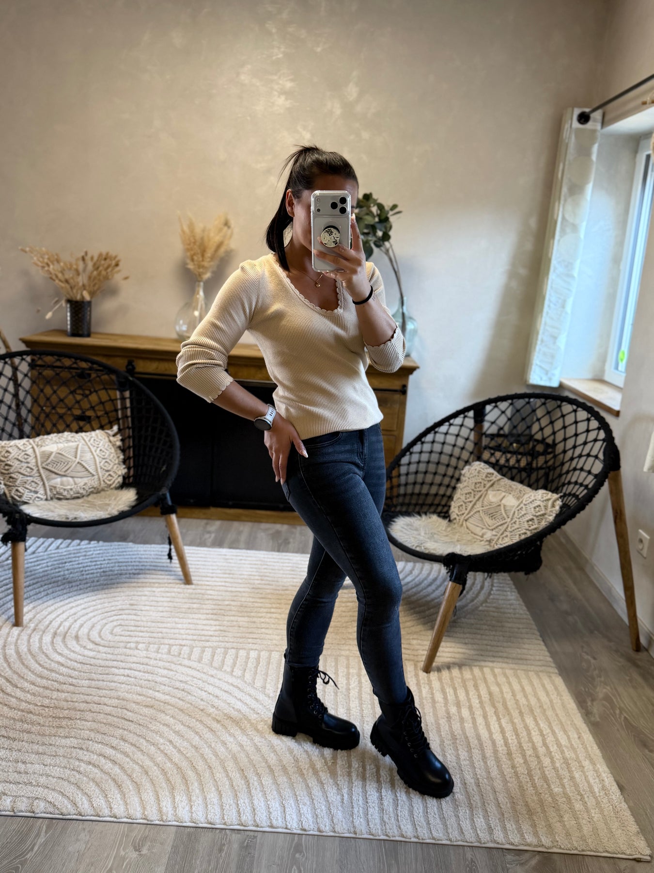 Alicia (1m57, porte du 36) présente ici le jean slim Apo associé au pull fin Aragone et à la veste Marthe noire pour un look moderne et élégant.