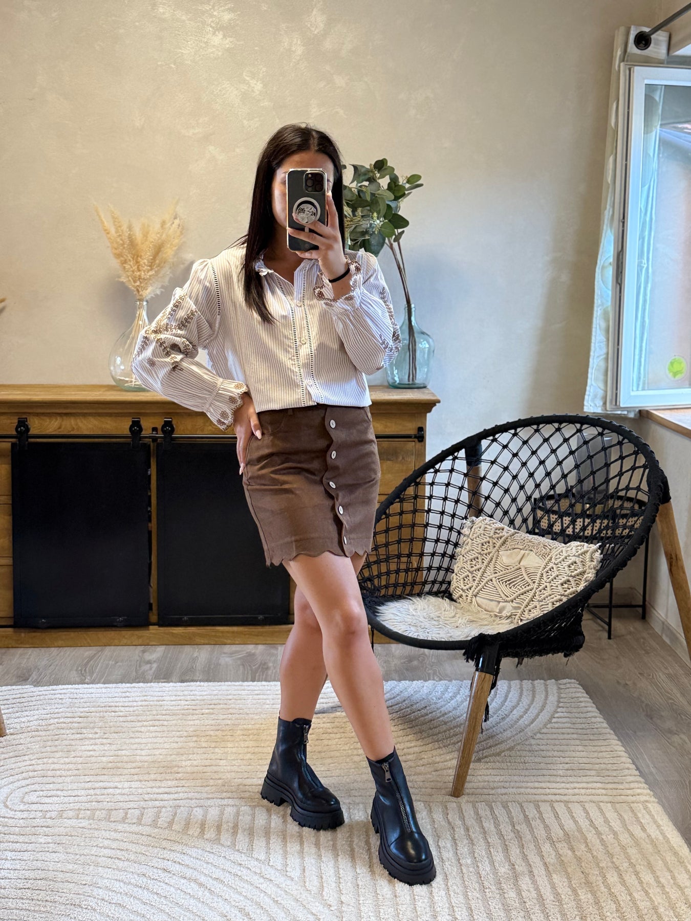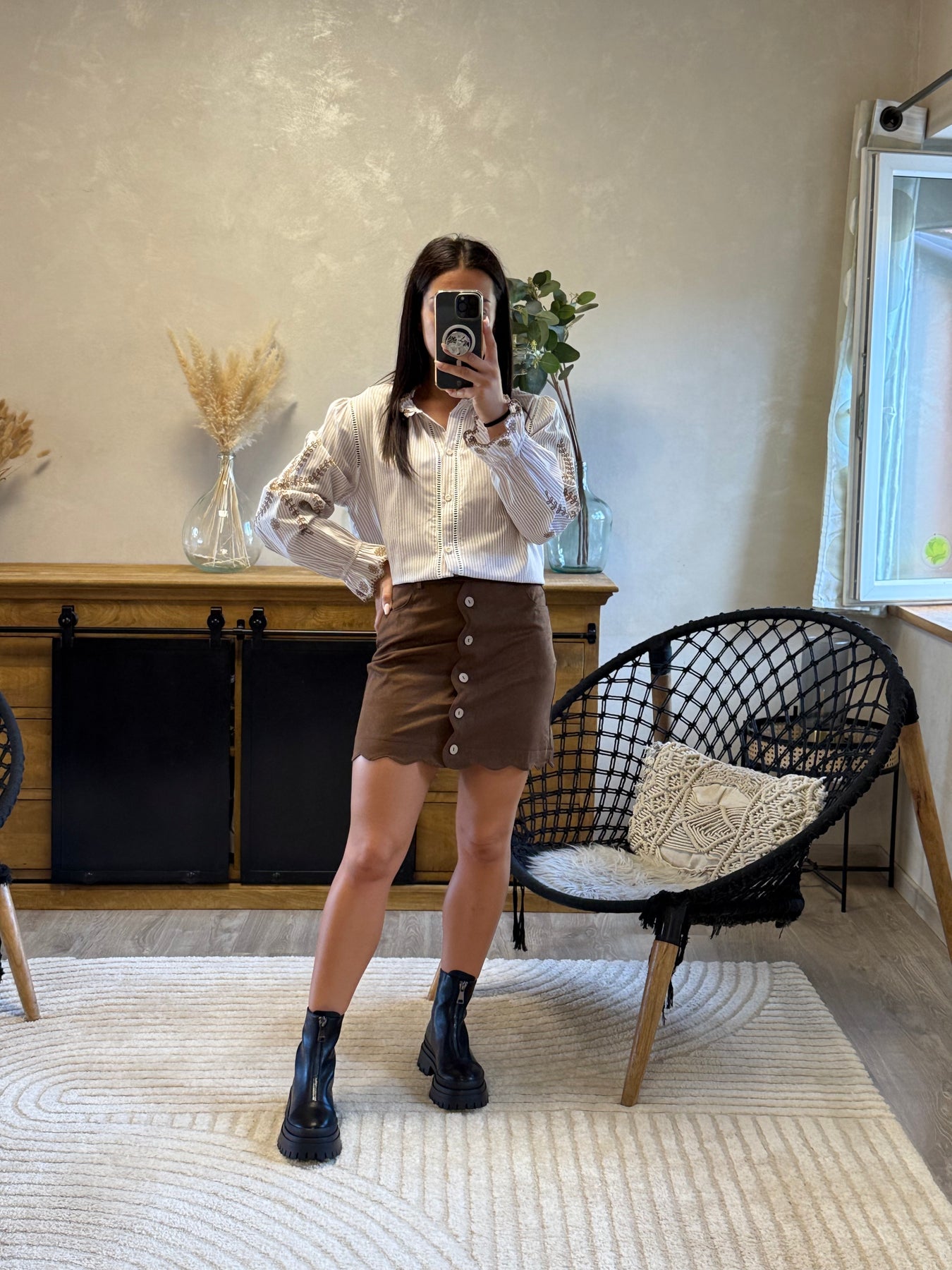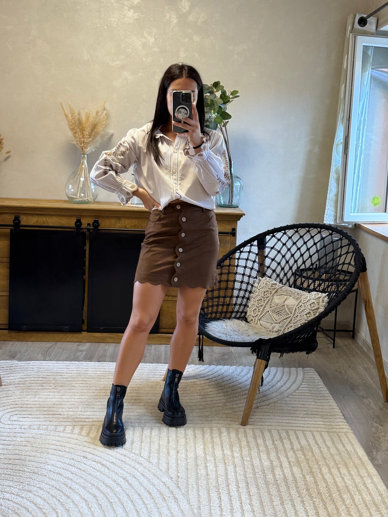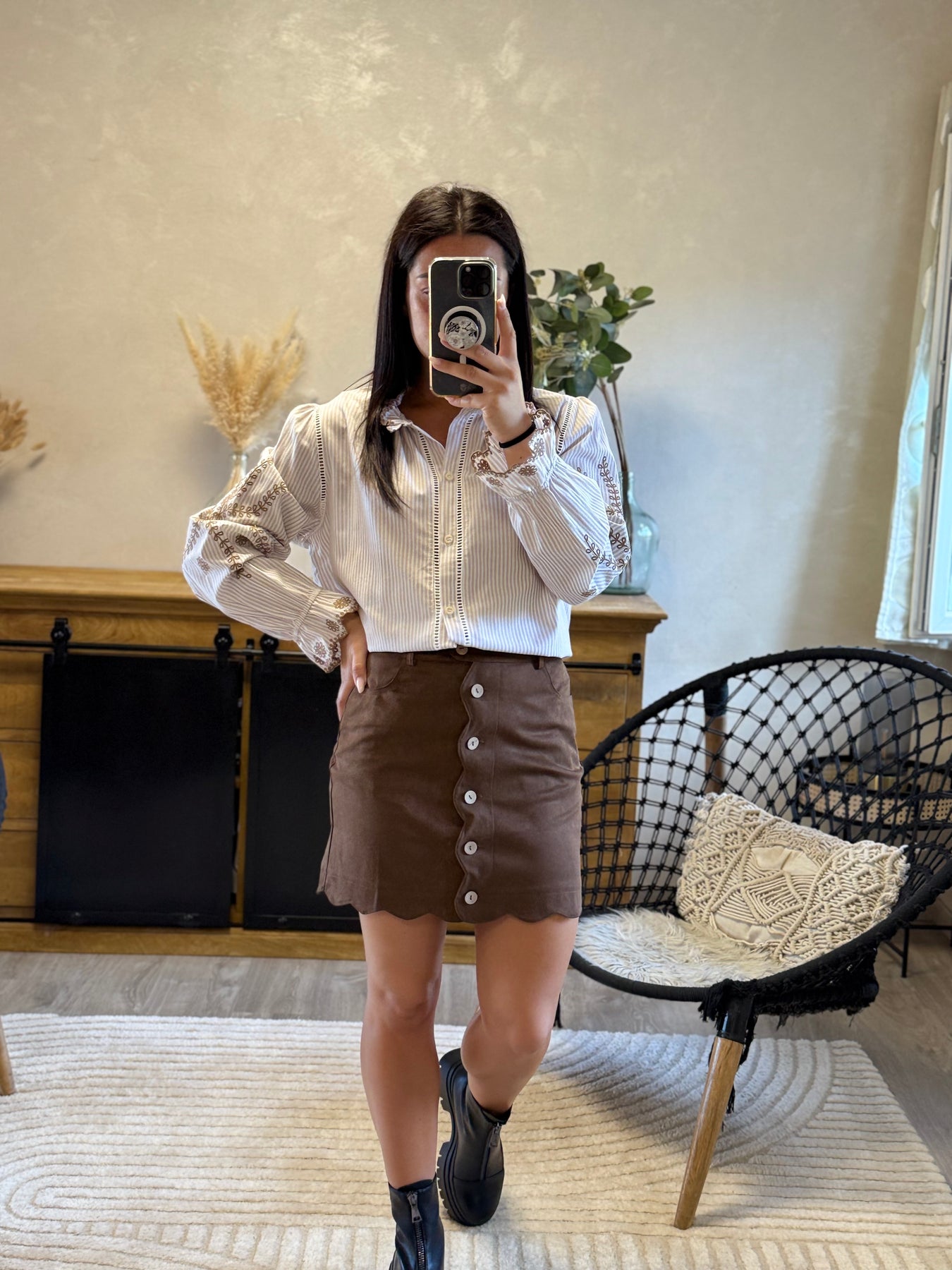 La jupe Kung est la pièce parfaite pour allier chic et originalité ✨. Son boutonage et ses finitions festonnées en font une jupe unique, facile à porter au quotidien avec une chemise habillée ou un pull cosy. Un indispensable pour un look féminin et moderne 🤎.