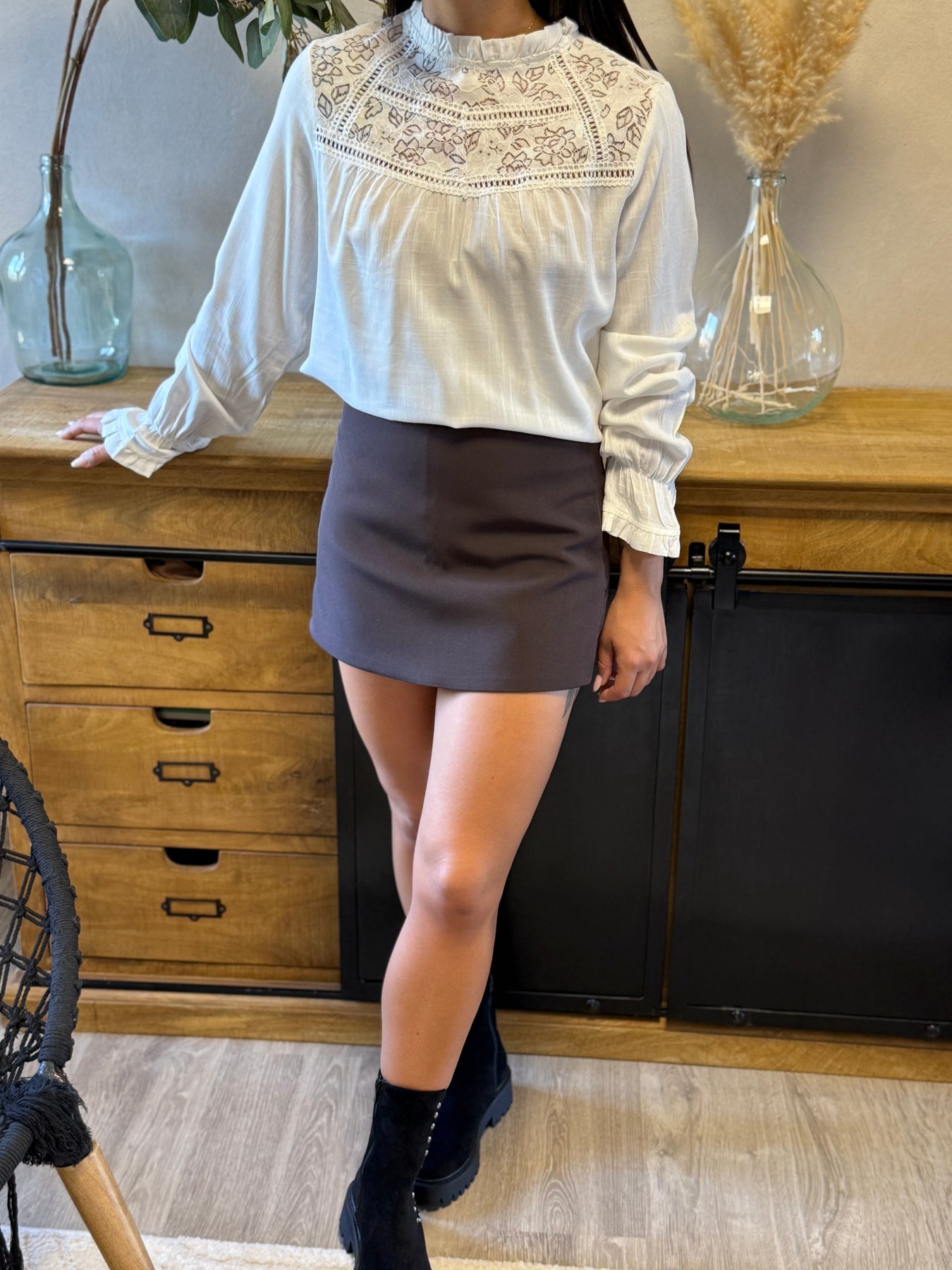 Alicia (1m57, porte du 36) présente ici la jupe-short Rafina associée à la blouse Saphia pour un look élégant et tendance.