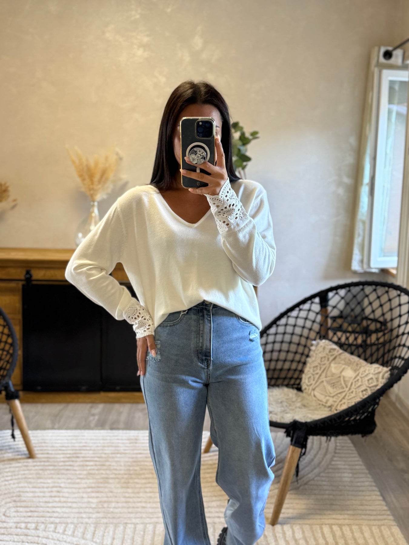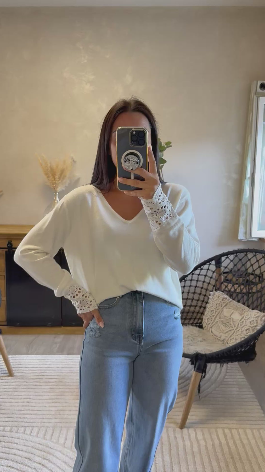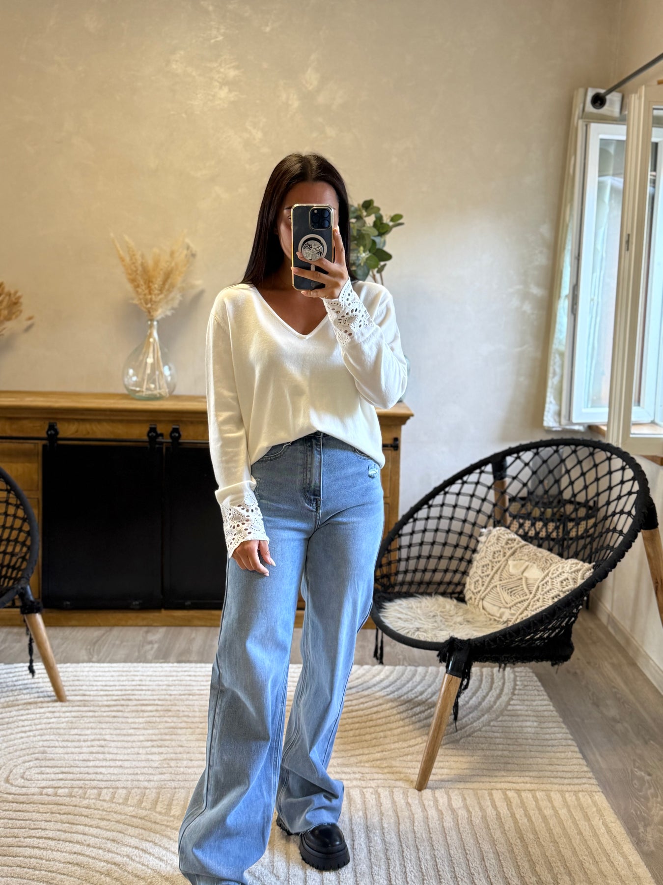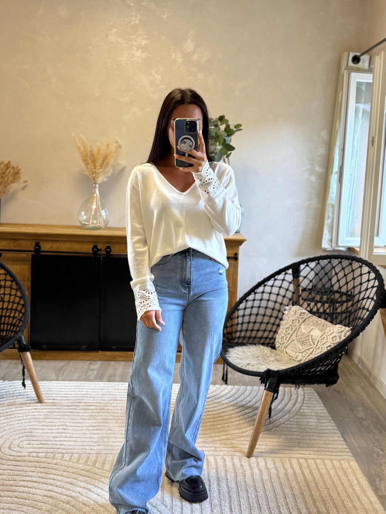 Le pull “Carlos” blanc est une pièce lumineuse et raffinée. Ses finitions en dentelle au dos et aux manches apportent une touche élégante, tandis que sa coupe simple et fluide le rend facile à porter au quotidien. Parfait avec un jean pour un look casual chic, ou avec une jupe pour une allure plus féminine.