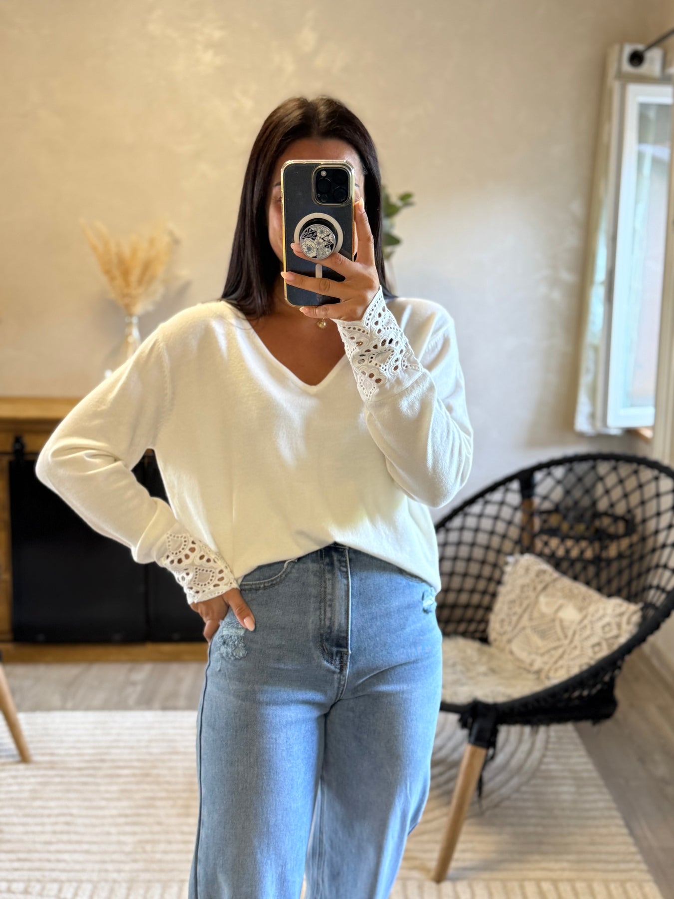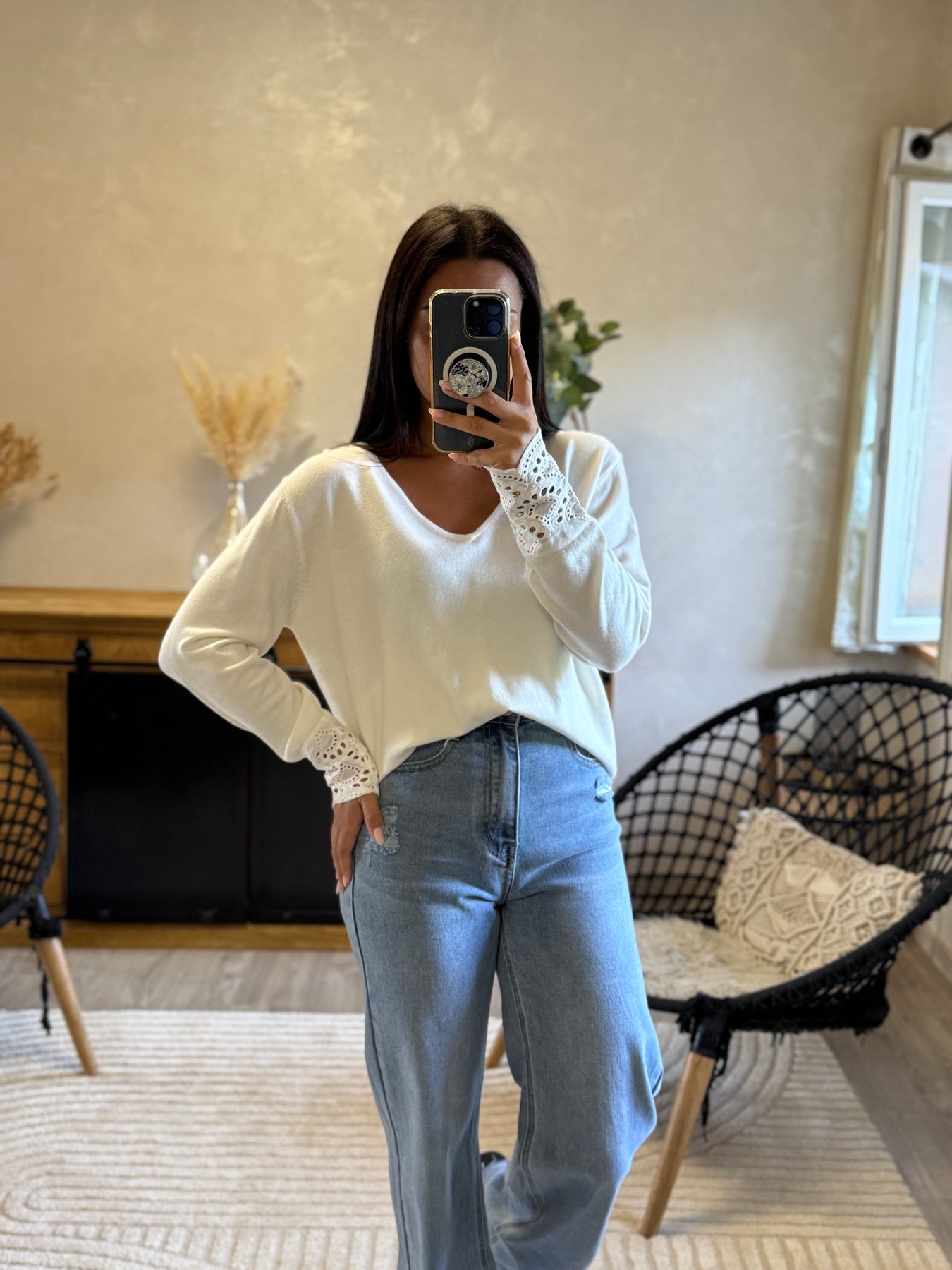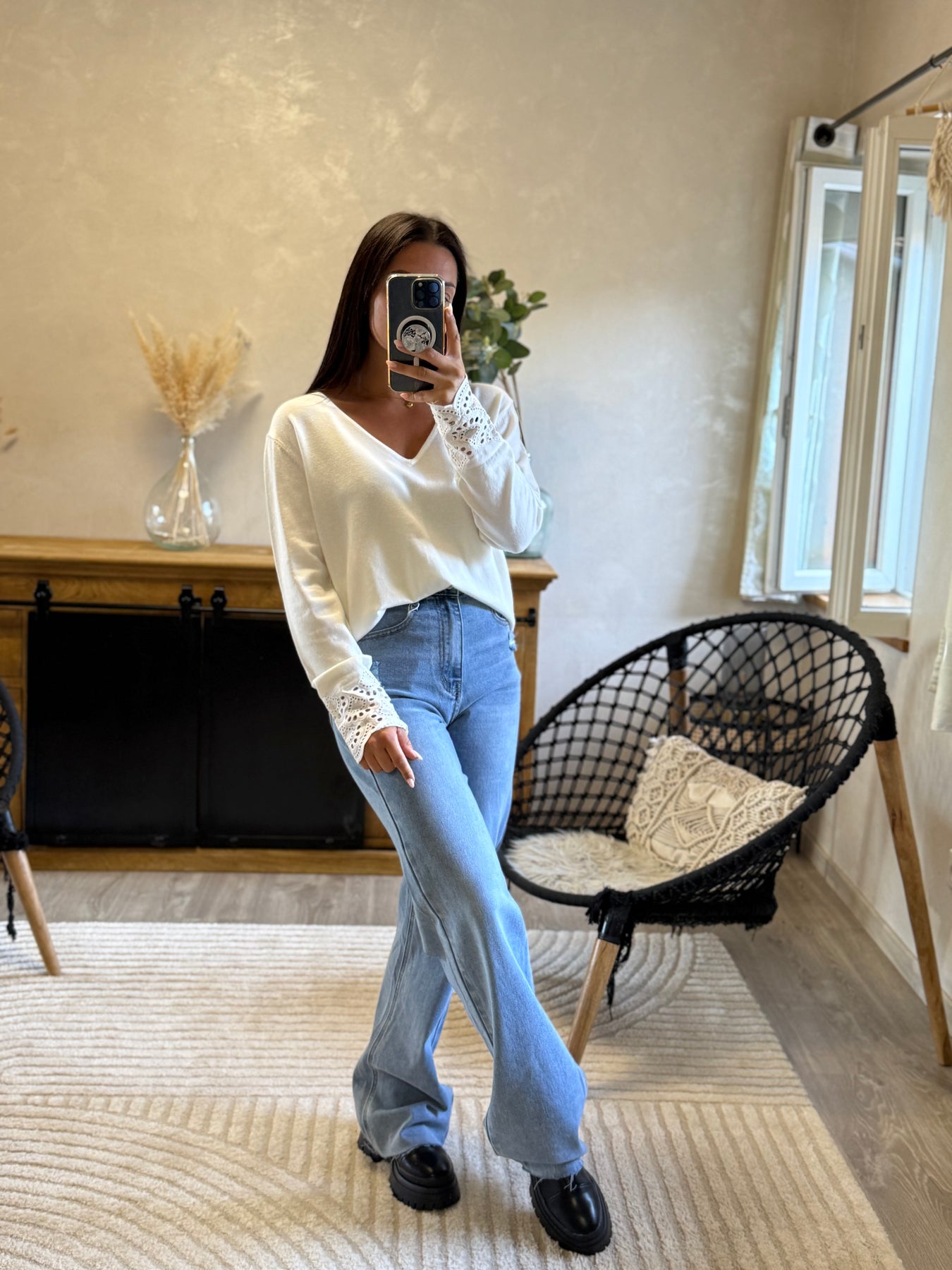 Le pull “Carlos” blanc est une pièce lumineuse et raffinée. Ses finitions en dentelle au dos et aux manches apportent une touche élégante, tandis que sa coupe simple et fluide le rend facile à porter au quotidien. Parfait avec un jean pour un look casual chic, ou avec une jupe pour une allure plus féminine.