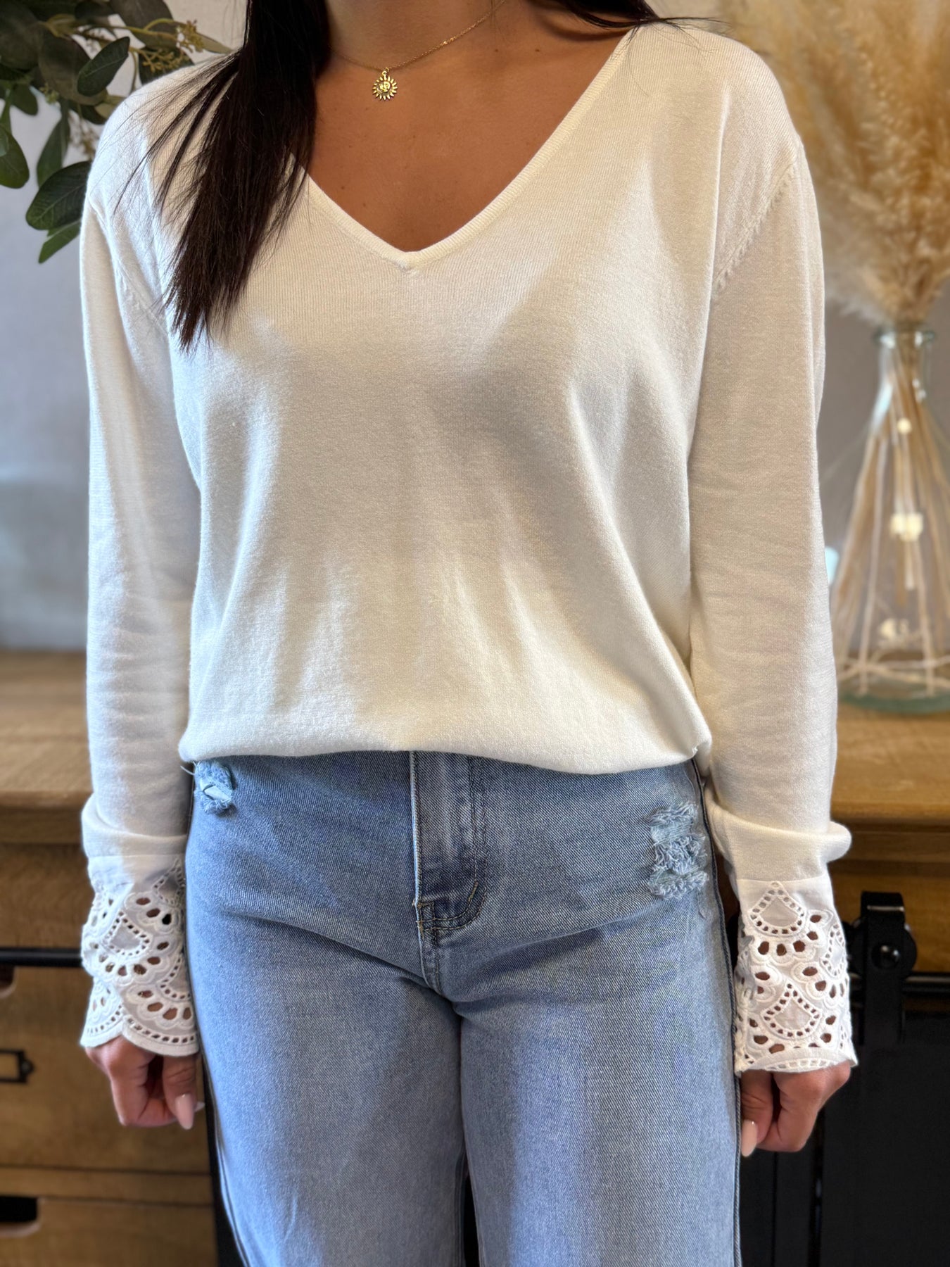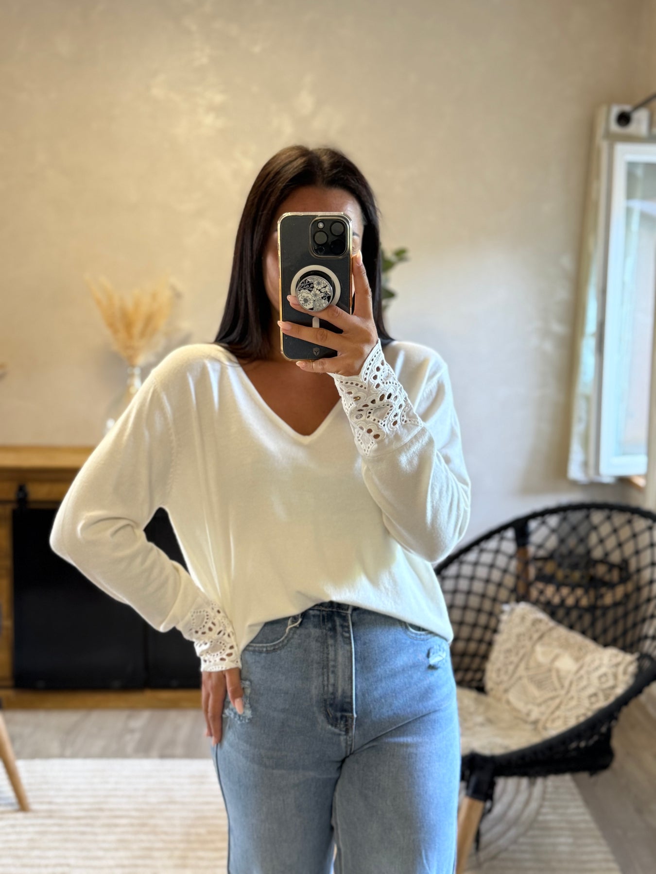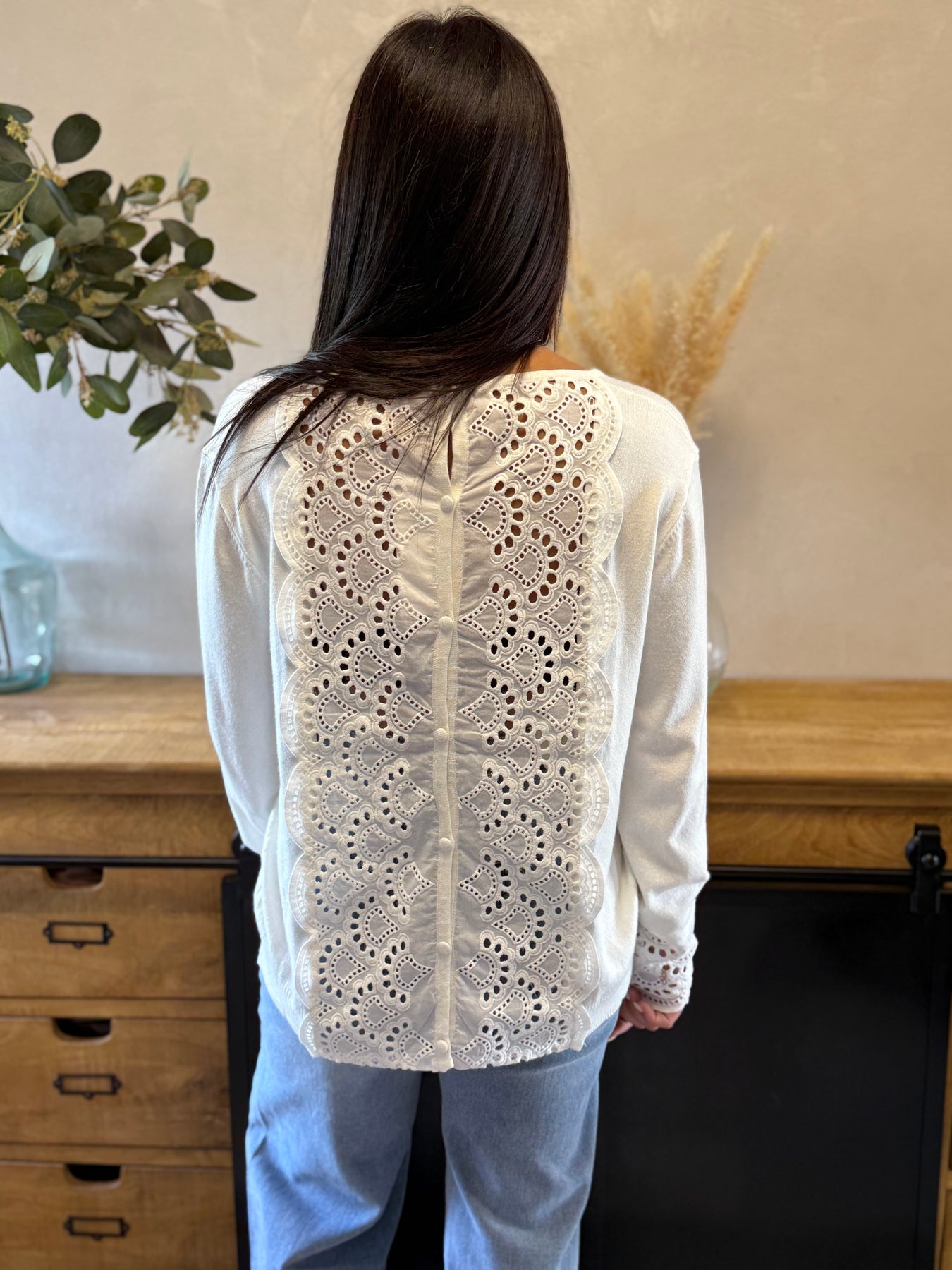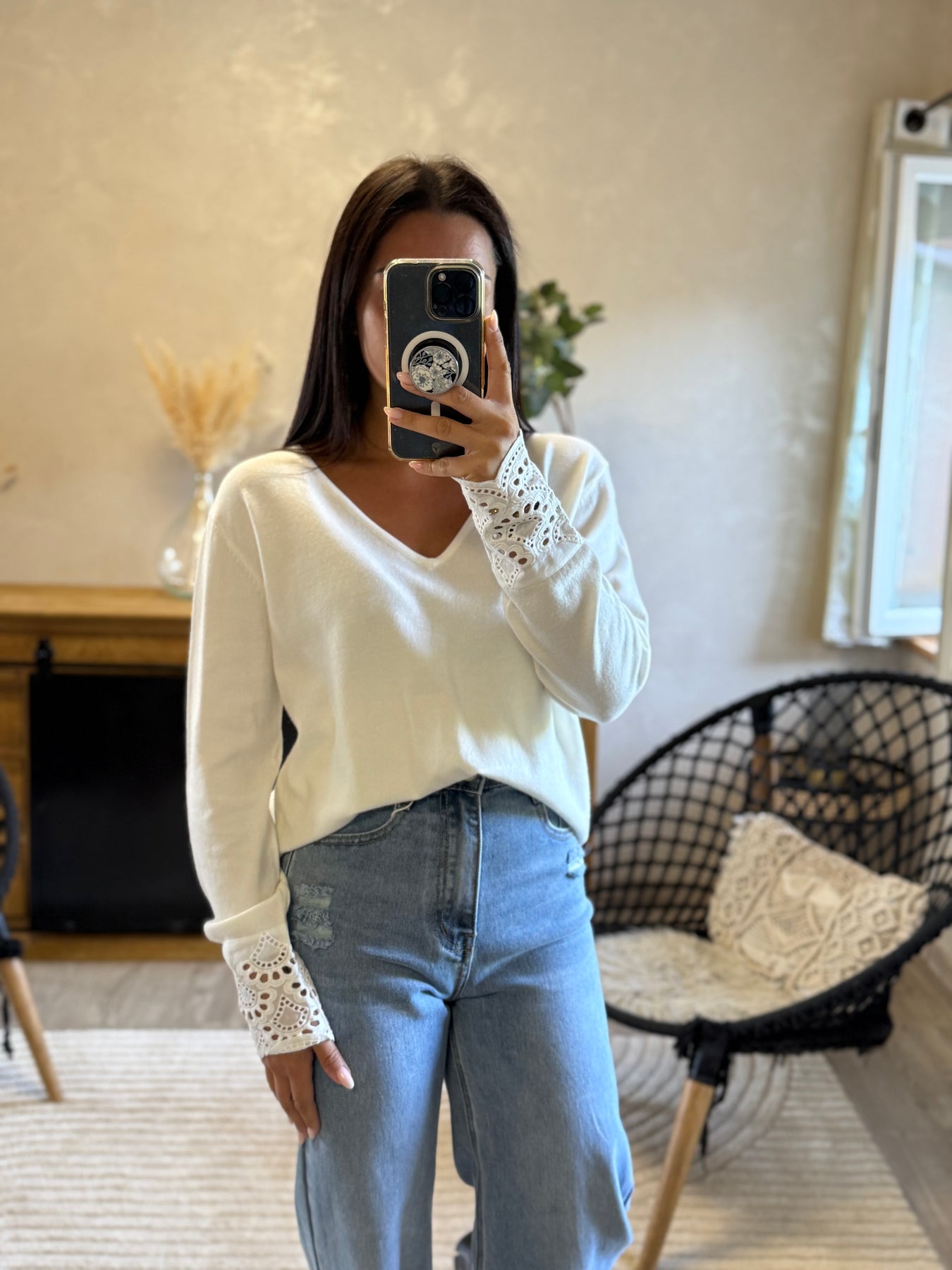 Le pull “Carlos” blanc est une pièce lumineuse et raffinée. Ses finitions en dentelle au dos et aux manches apportent une touche élégante, tandis que sa coupe simple et fluide le rend facile à porter au quotidien. Parfait avec un jean pour un look casual chic, ou avec une jupe pour une allure plus féminine.