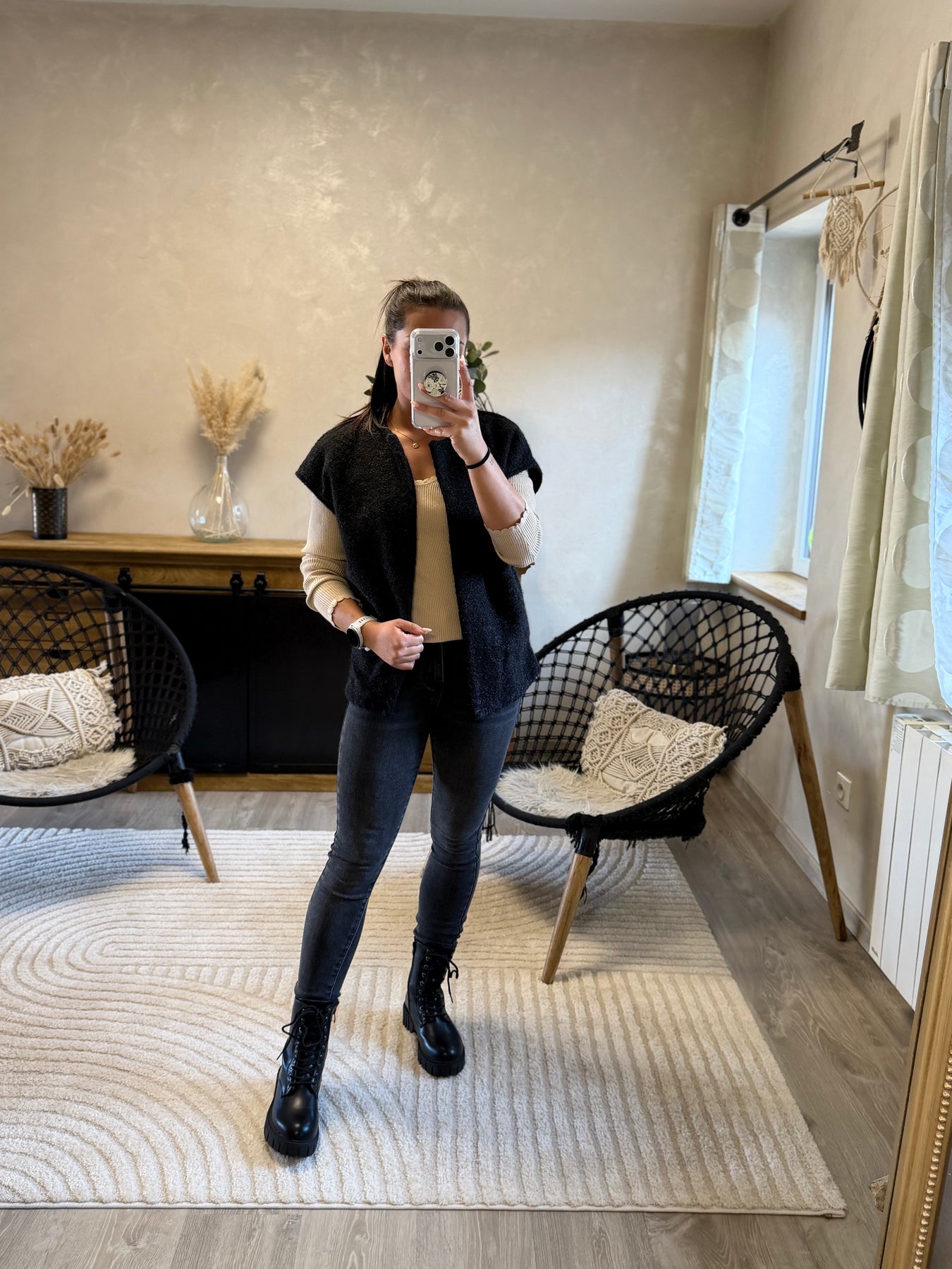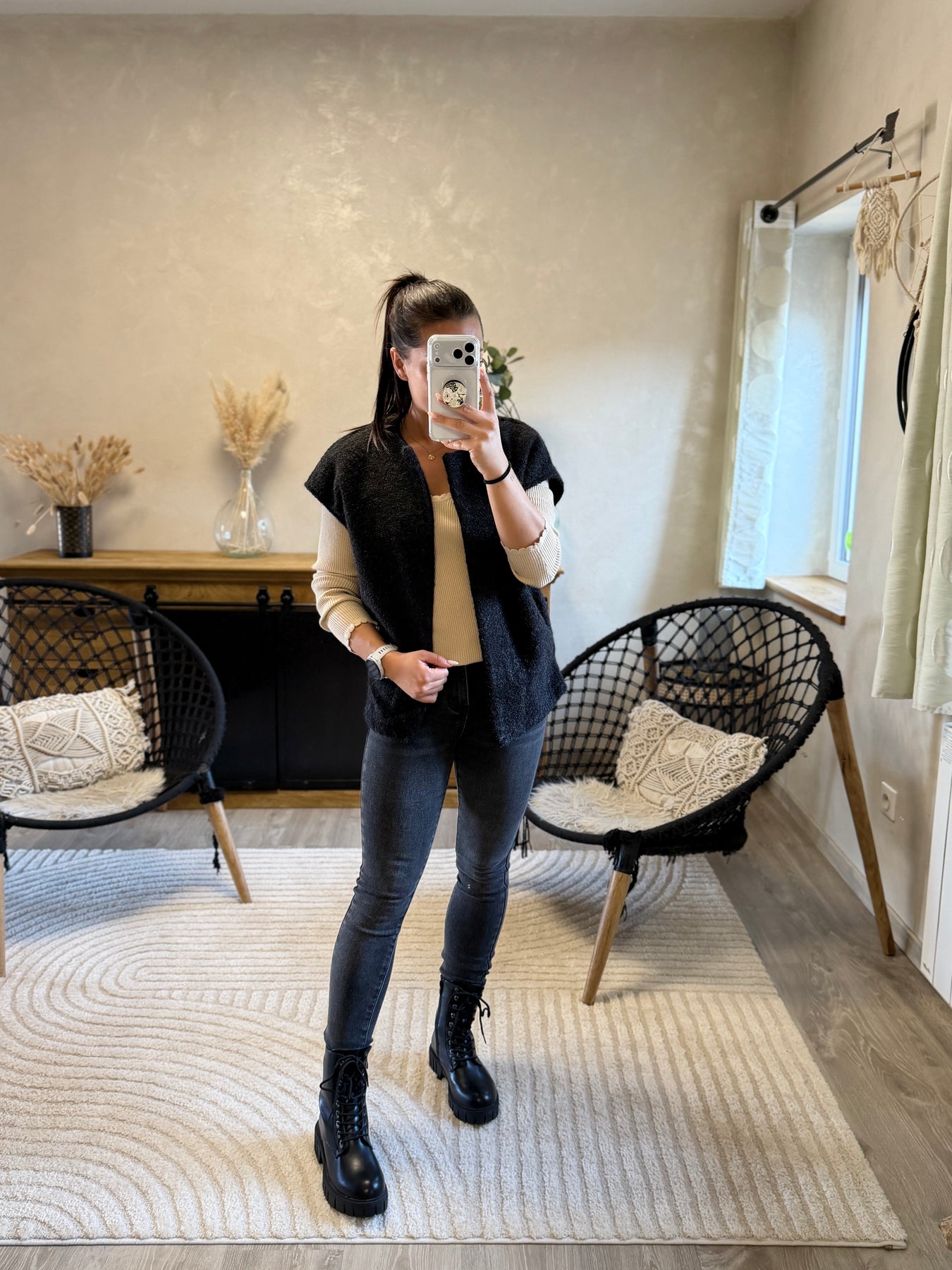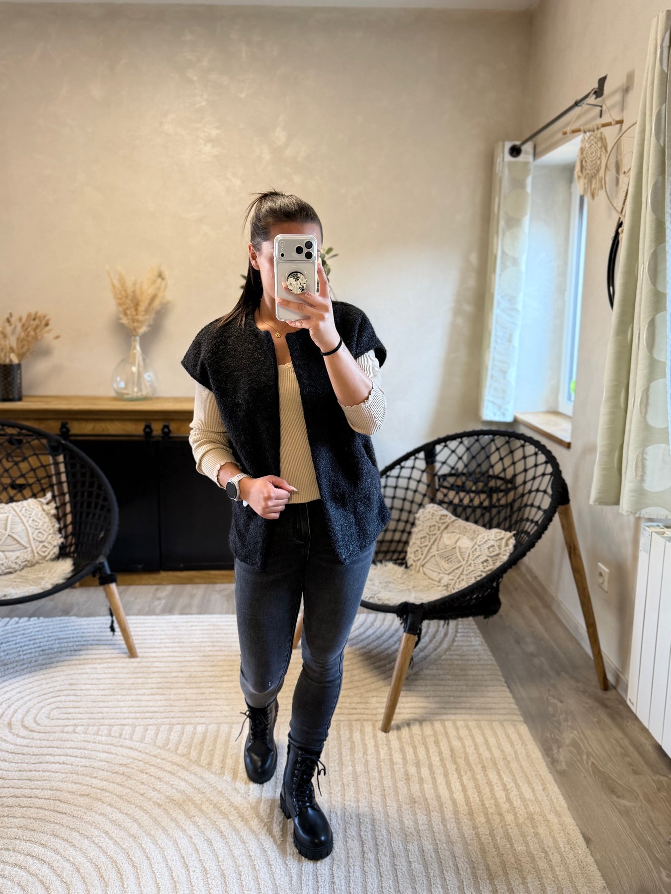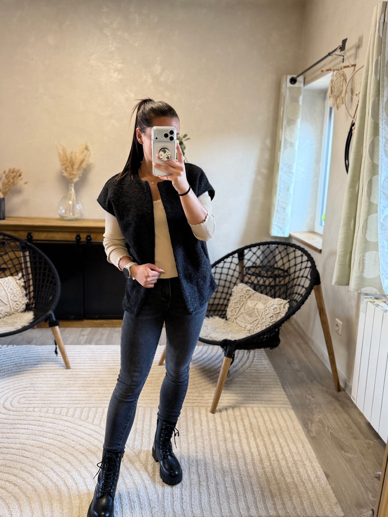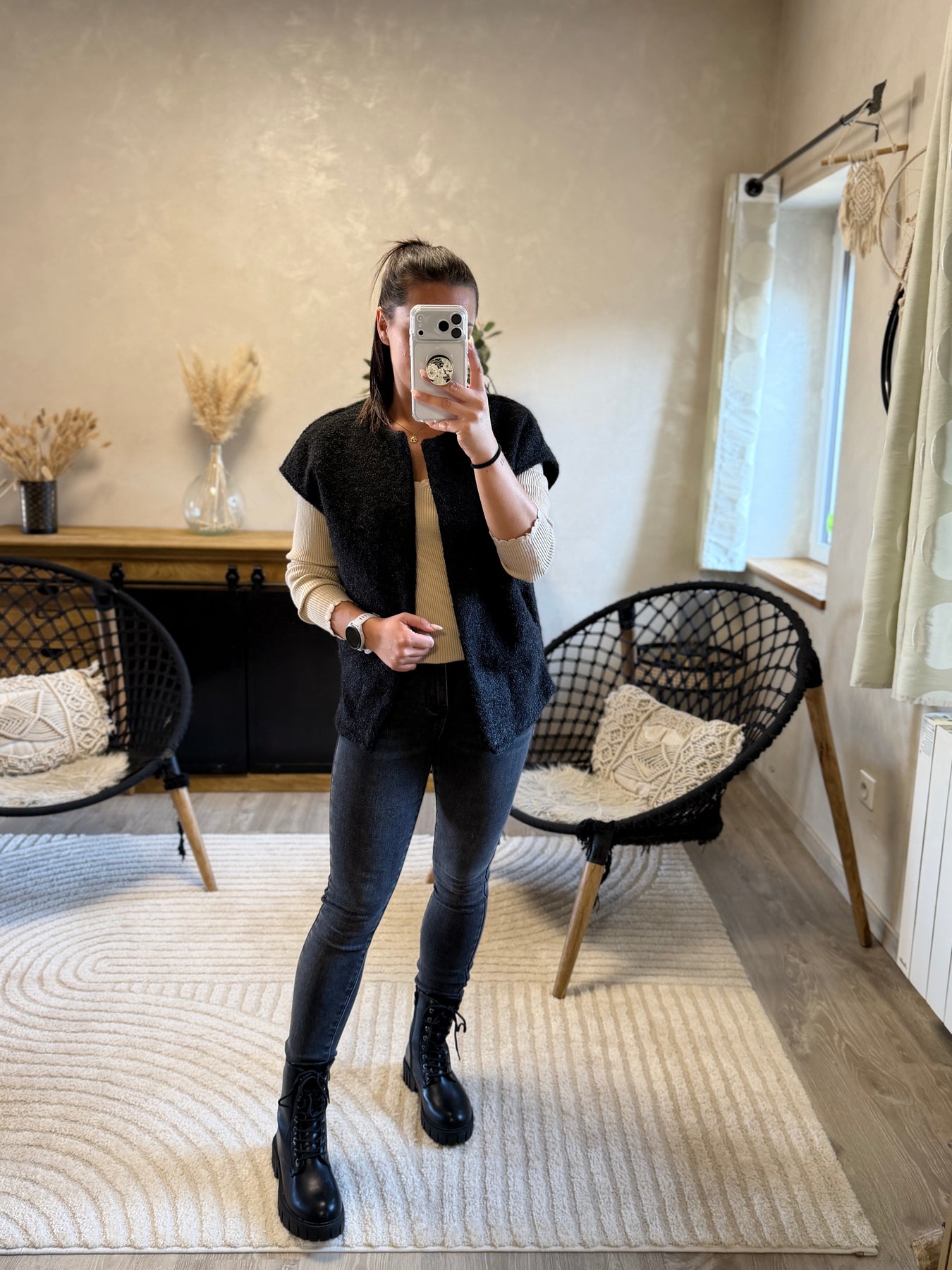 Alicia (1m57, porte du 36) présente ici le pull fin Aragone associé au jean slim Apo et à la veste Marthe noire pour un look chic et moderne.