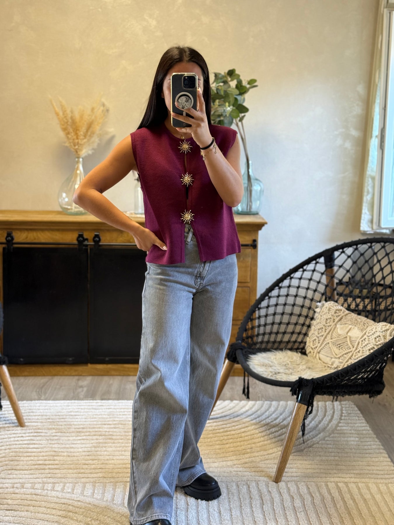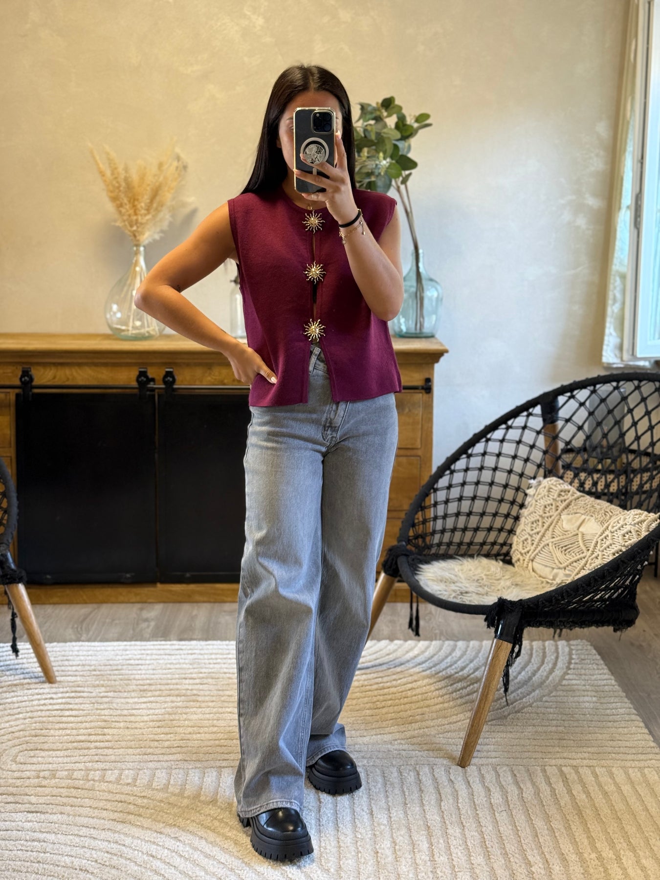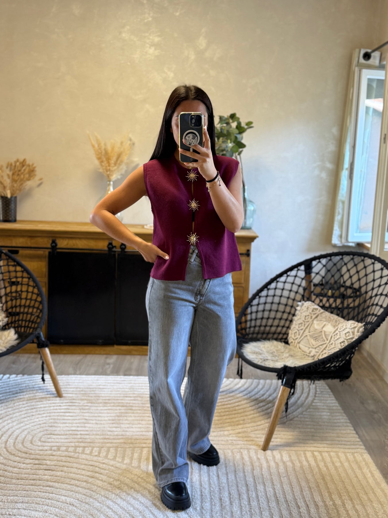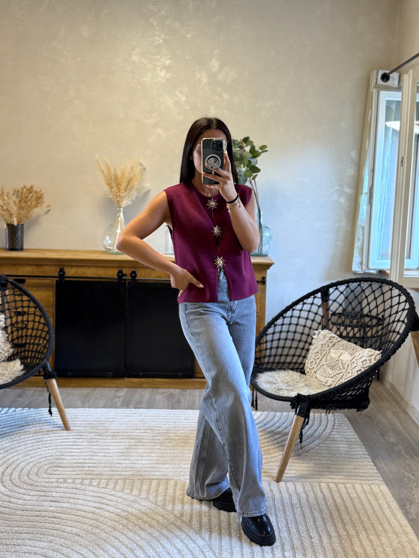 Le gilet “Gabin” est la pièce qui habille instantanément une tenue ! Avec ses détails bijoux façon soleil doré, il apporte une touche chic et lumineuse. On le porte aussi bien ouvert sur une chemise blanche que fermé avec un jean taille haute pour un look moderne et sophistiqué.