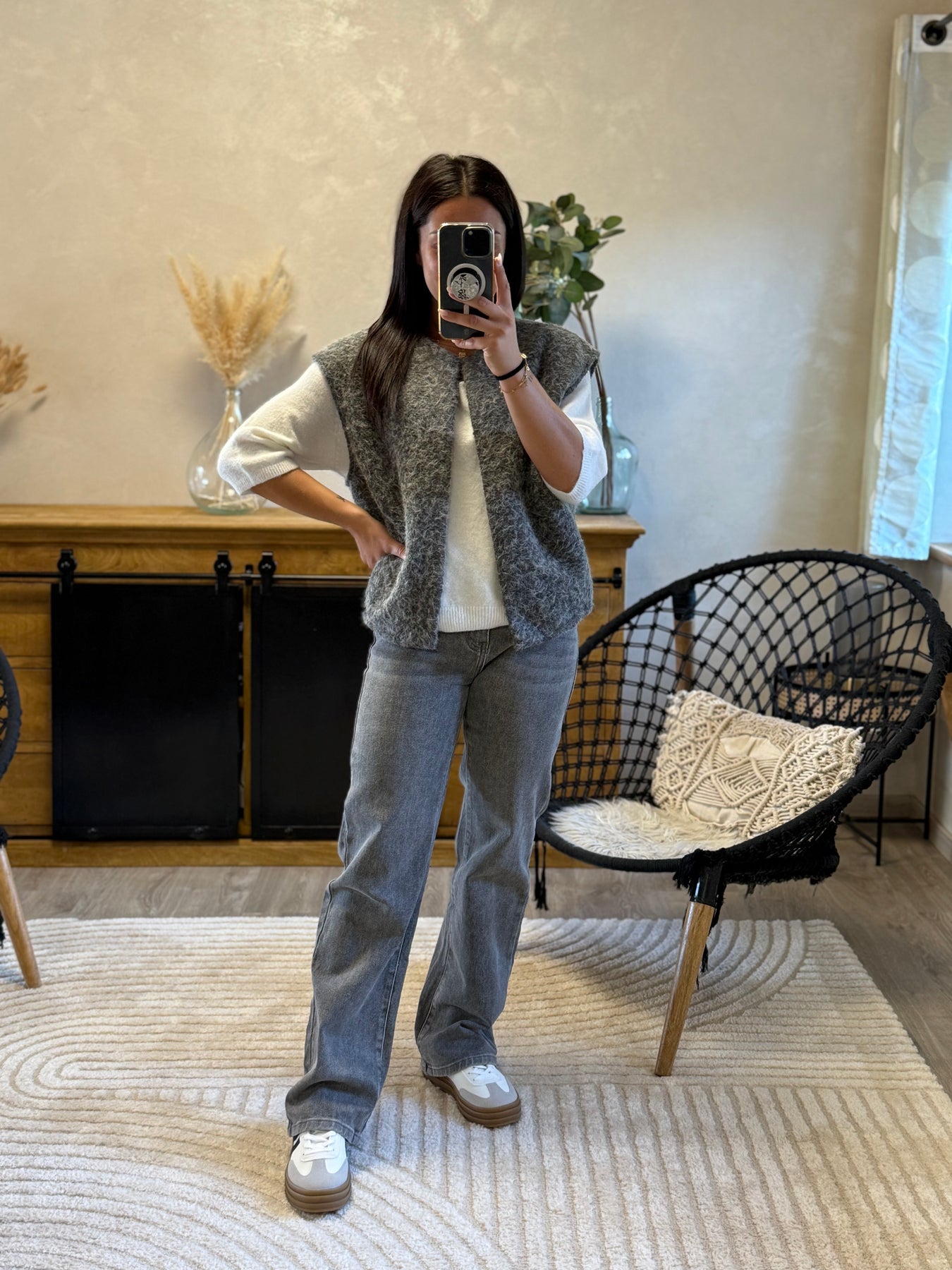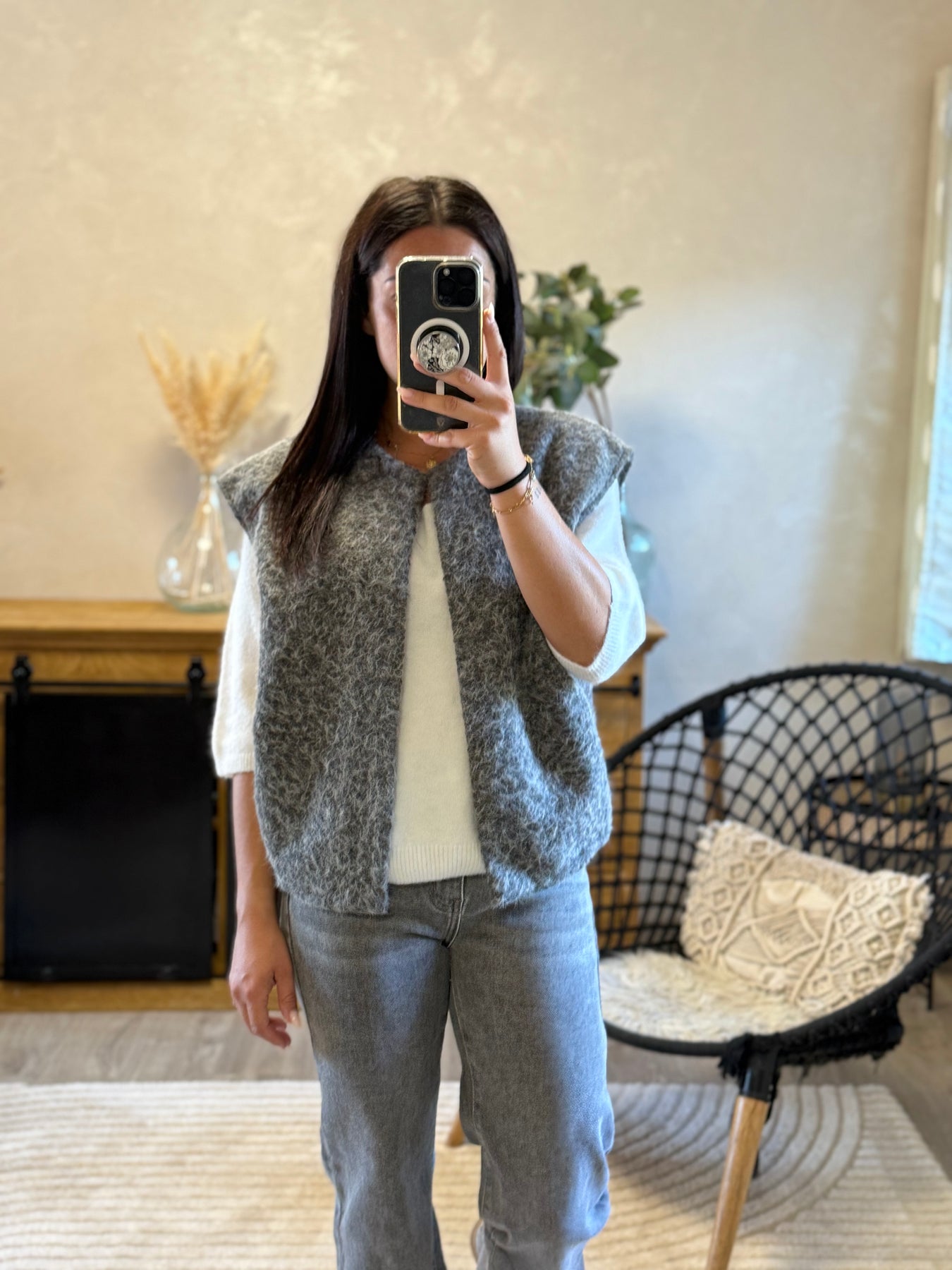 Alicia (1m57, porte du 36) présente ici le pull Siméon associé au gilet sans manches gris et au jean Star pour un look cosy et moderne.