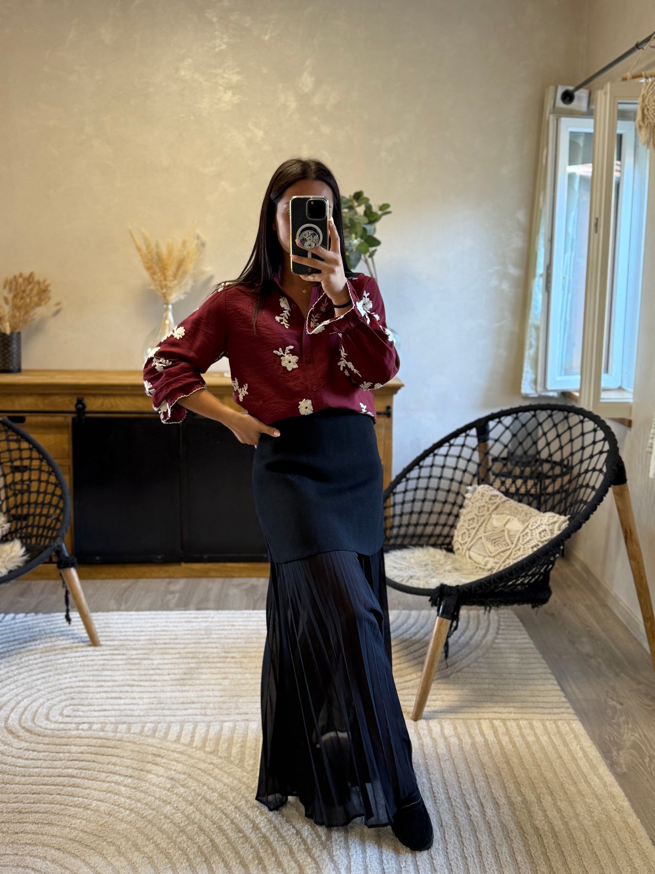 La chemise Elisa Curvy est un véritable coup de cœur 💕. Fluide, chic et féminine, elle met en valeur la silhouette avec élégance. Ses broderies blanches délicates contrastent à merveille avec le fond bordeaux pour un rendu raffiné. À porter avec une jupe longue plissée pour un look sophistiqué ou avec un pantalon ajusté pour un style plus moderne.