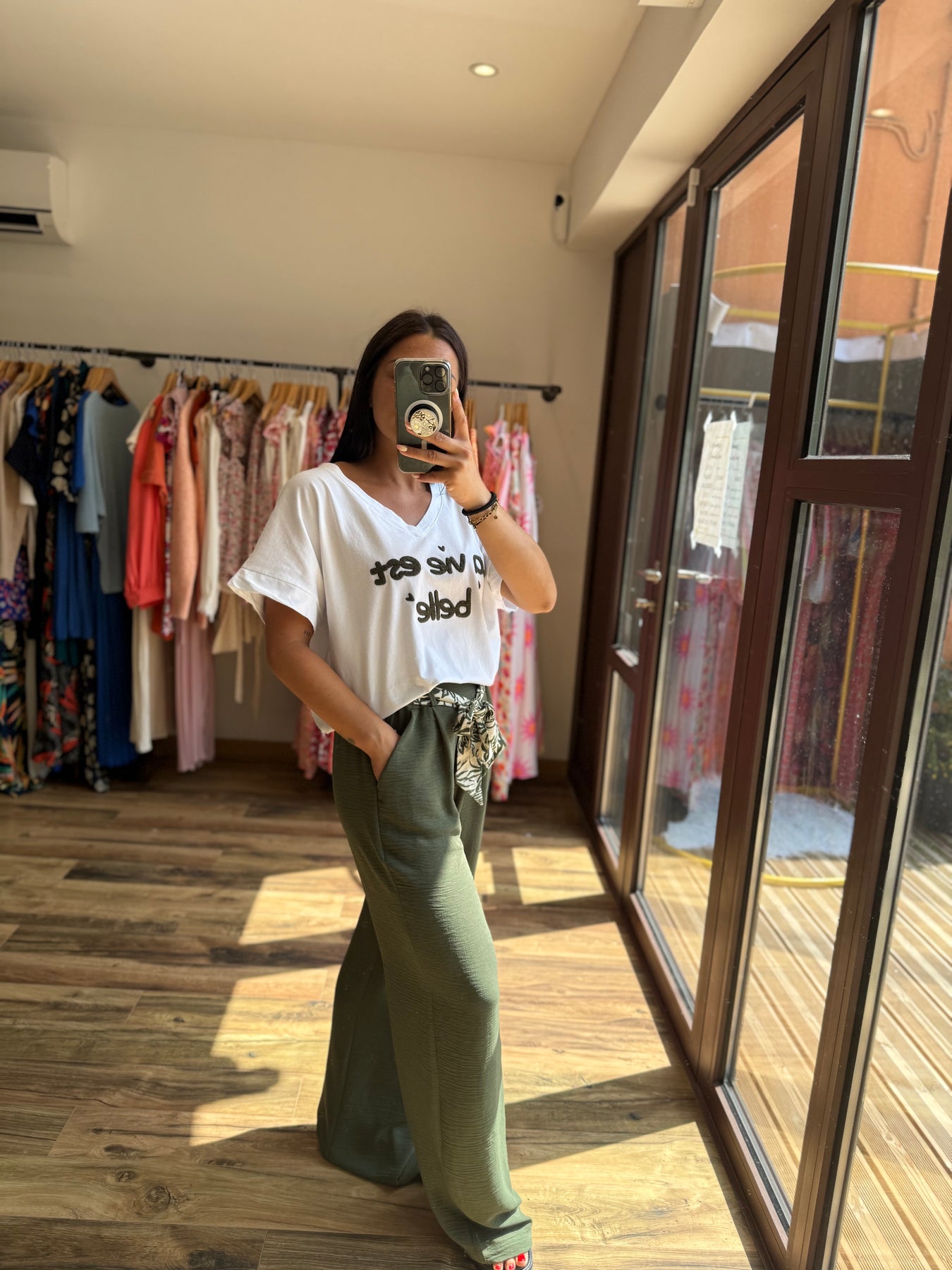 Un basique pas si basique avec son message positif et ses lettres texturées. Il se marie parfaitement avec le pantalon Eliam kaki pour un look décontracté et harmonieux, pile dans les tons tendance de la saison 🌿