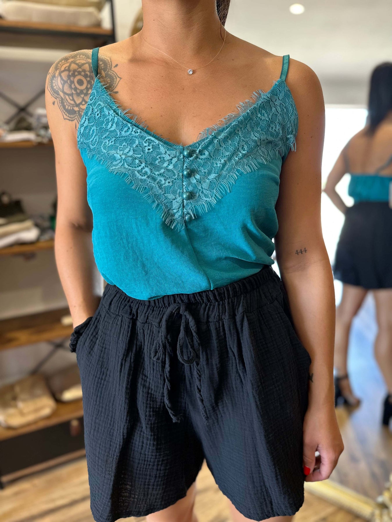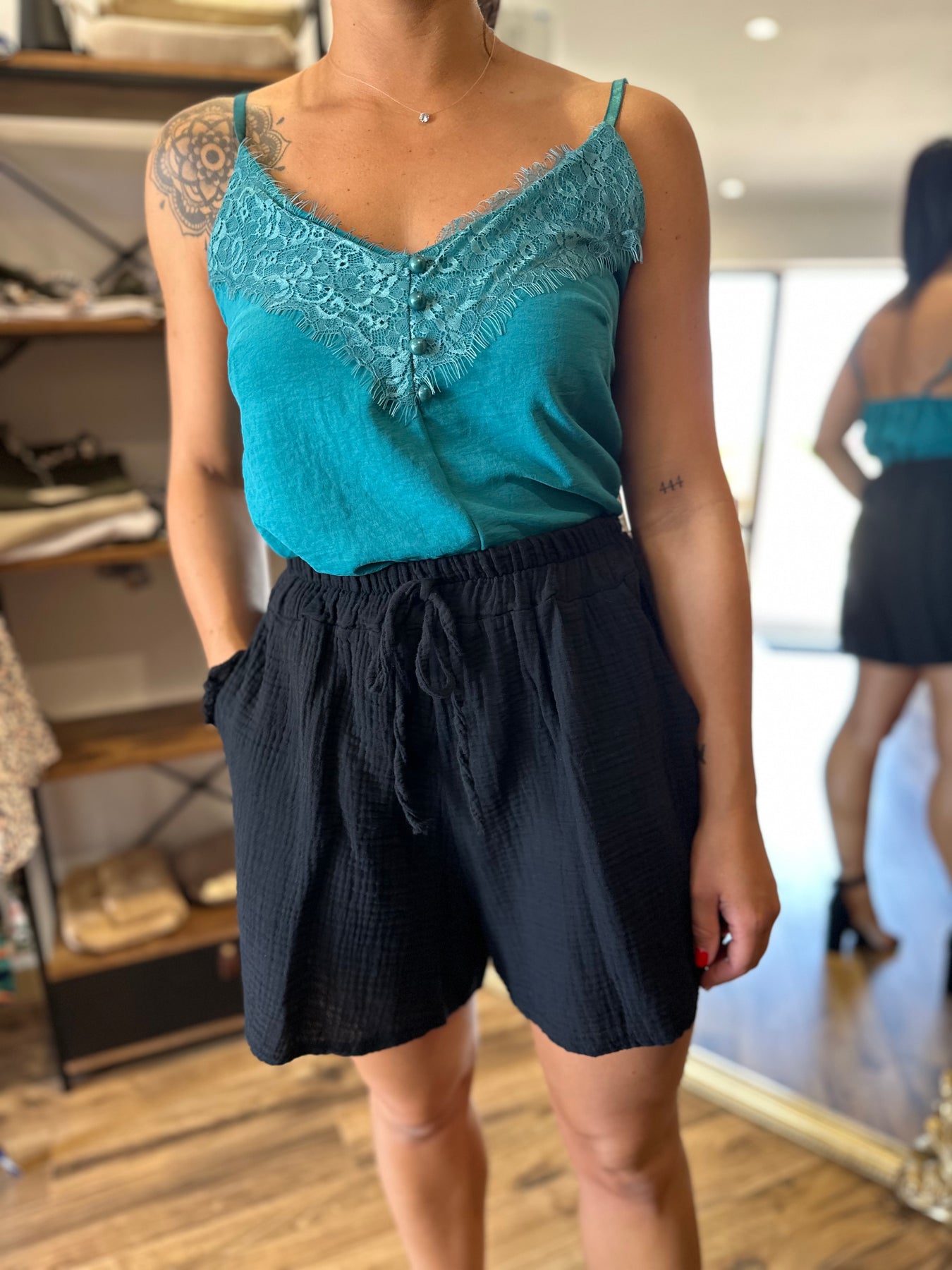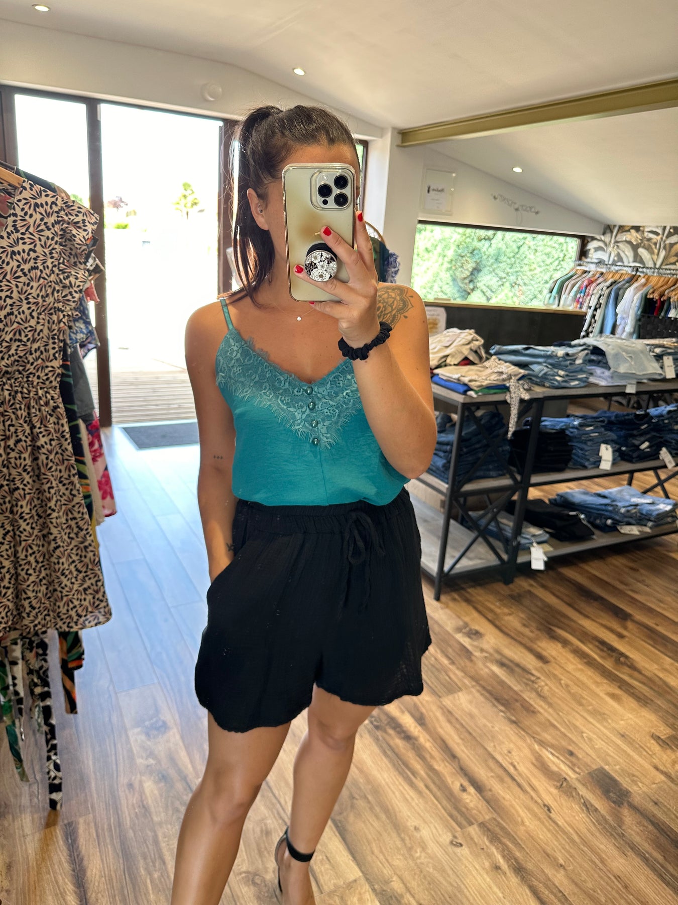 Alicia mesure 1m57 et met du 36 elle porte le top avec le short en gaze de coton noir