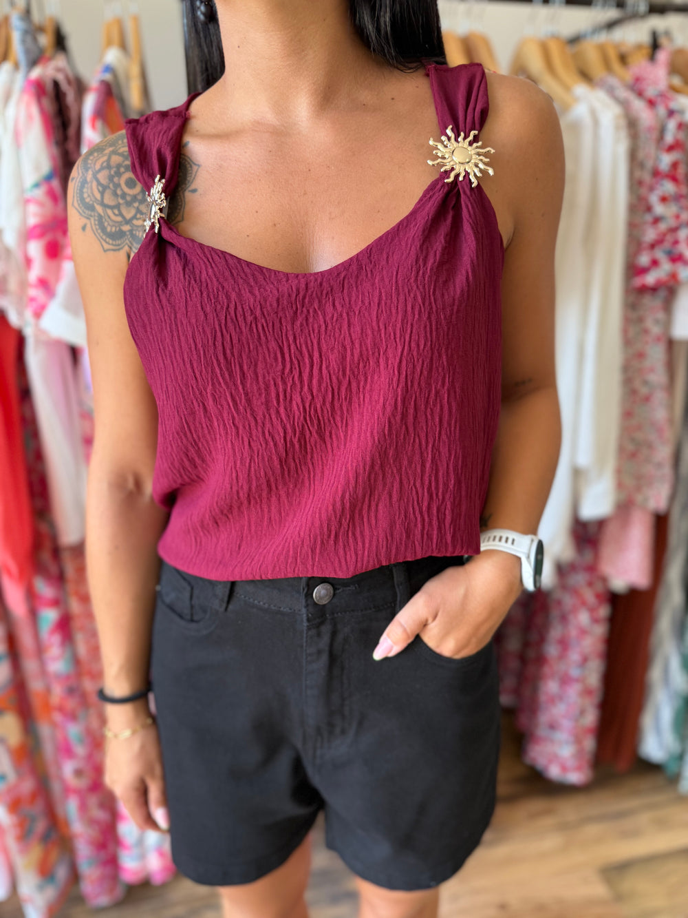 🌞 Ce top est un vrai bijou à lui tout seul ! Avec ses détails dorés en forme de soleil sur les épaules, il apporte une touche lumineuse et originale à vos looks d’été. Sa matière fluide et son tombé élégant en font une pièce facile à porter, aussi bien en journée qu’en soirée. Canon avec un short comme ici, mais aussi parfait rentré dans une jupe ou un jean taille haute. Un top qui attire la lumière et les compliments ✨